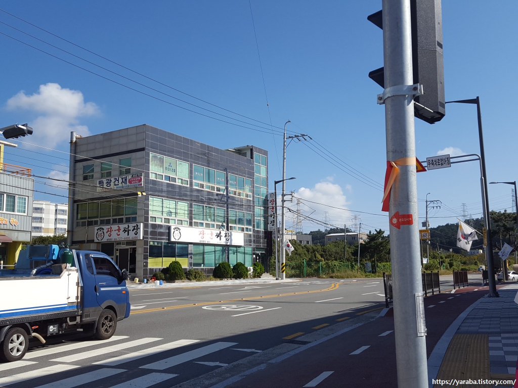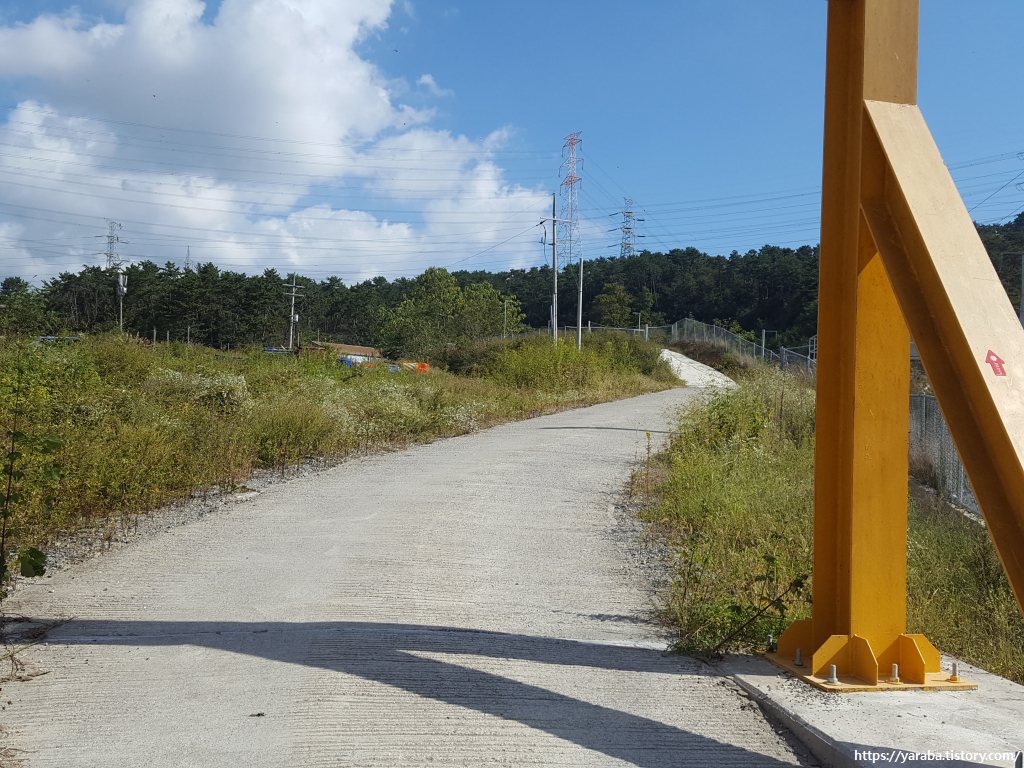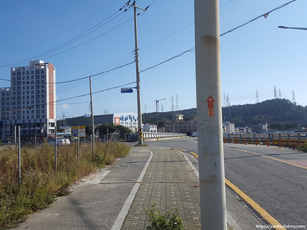 해파랑길 대부분은 해안길을 걷던가, 산길을 걸으므로 안전하고, 도로변을 걷더라도 자전거, 보행자 겸용 도로나 보행자 전용길을 걷기 때문에 큰 위험성은 없지만 이곳은 조금 위험하다. 덤프트럭들이 씽씽 달리는 도로변을 위축된 자세로 조심해서 걸어가야 한다.