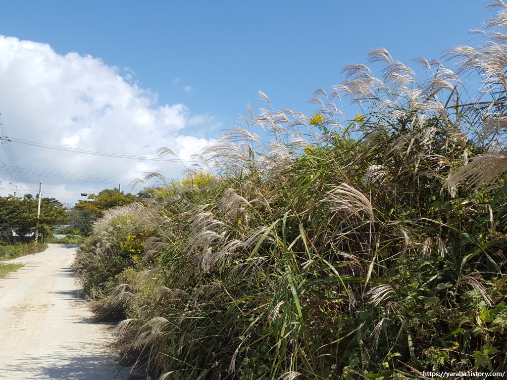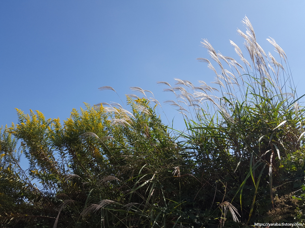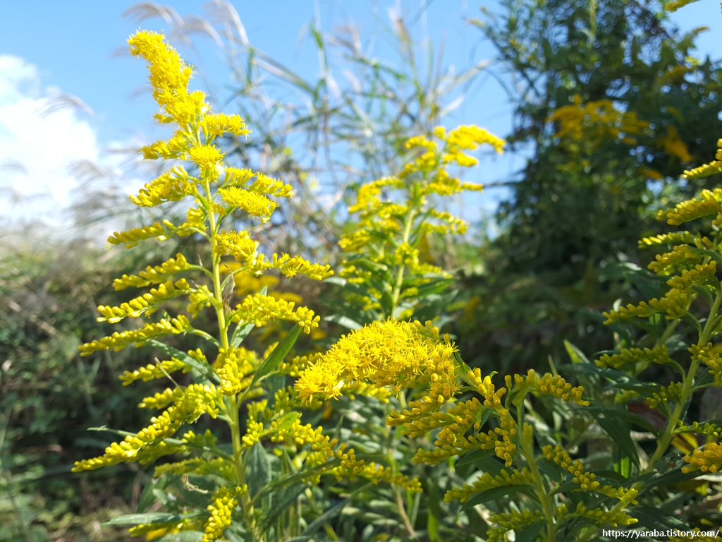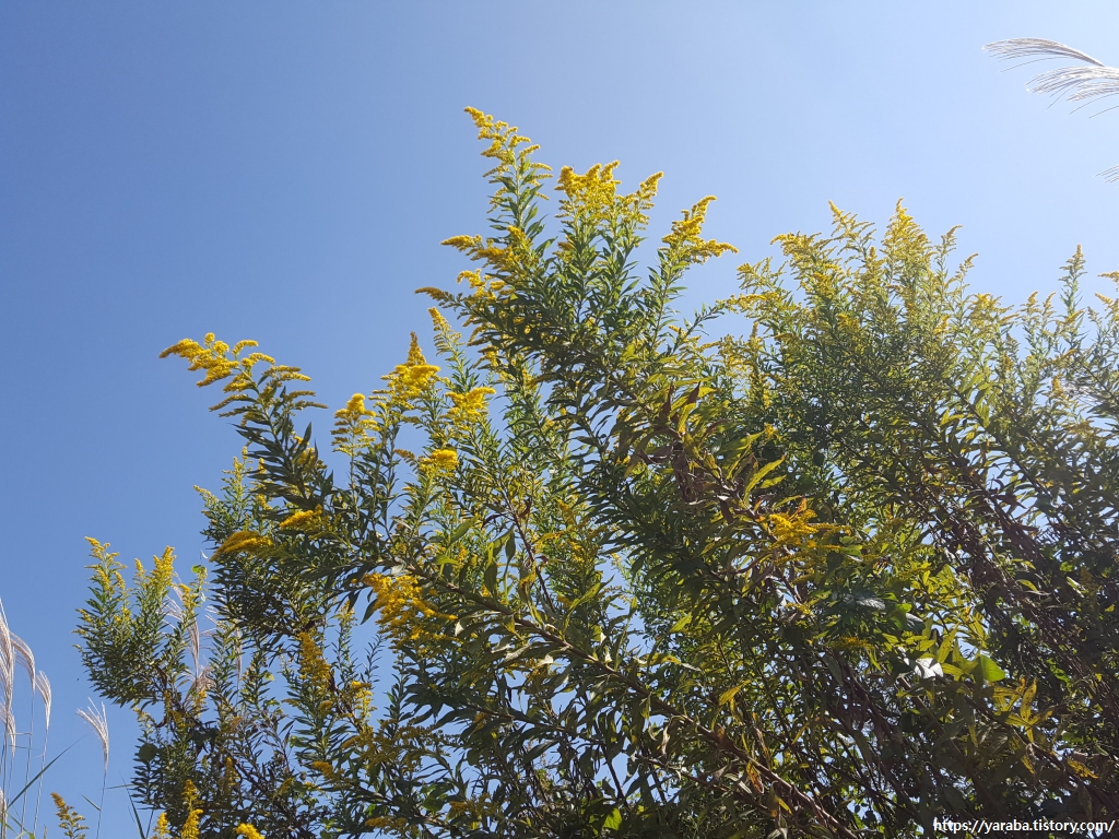 미국미역취의 노란 꽃과 억새가 가을빛에 어우러져 환상적인 풍경을 선사한다.