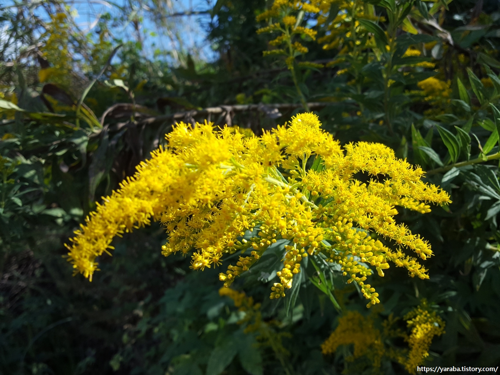 미국미역취는 국화과의 여러해살이풀로 키가 1미터 정도로 크는데 귀화 식물로 전국적으로 퍼지고 있다 한다. 미역취는 메역취라고도 부르고 영어 이름으로는 골든 로드(goldenrod)인데 잎이나 꽃에서 미역 냄새가 난다고 붙은 이름이라고 한다. 약재로 쓰인다고도 한다. 재미있는 것은 산성, 염기성을 측정하는 리트머스 종이처럼 골든 로드 종이(goldenrod paper)라는 종이가 있는데 염기성에만 반응하면 붉은색으로 바뀌는 종이로 미역취 꽃의 색처럼 진한 노란색이라 붙은 이름인 모양이다.