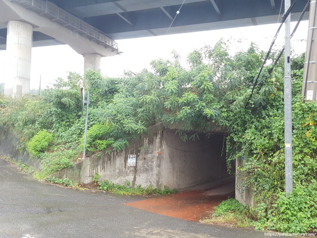 동천 1교를 통해 회야강을 건너면 다리 끝에서 U턴하라는 안내판을 만난다. 길 끝에서 오른쪽으로 돌아 방금 건너왔던 동천 1교 아래를 통해서 동천리 마을길로 걸어간다. 아마도 인도나 자전거 도로가 없는 4차선의 14번 국도변을 걷는 것은 위험하기 때문에 길을 돌아서 가게 한 모양이다. 가는 길에는 철도를 넘어가는 다리를 포함하여 동천 2교, 동천 3교라는 다리를 두 개나 넘어야 하는데 자전거나 사람을 위한 길은 없기 때문이다.