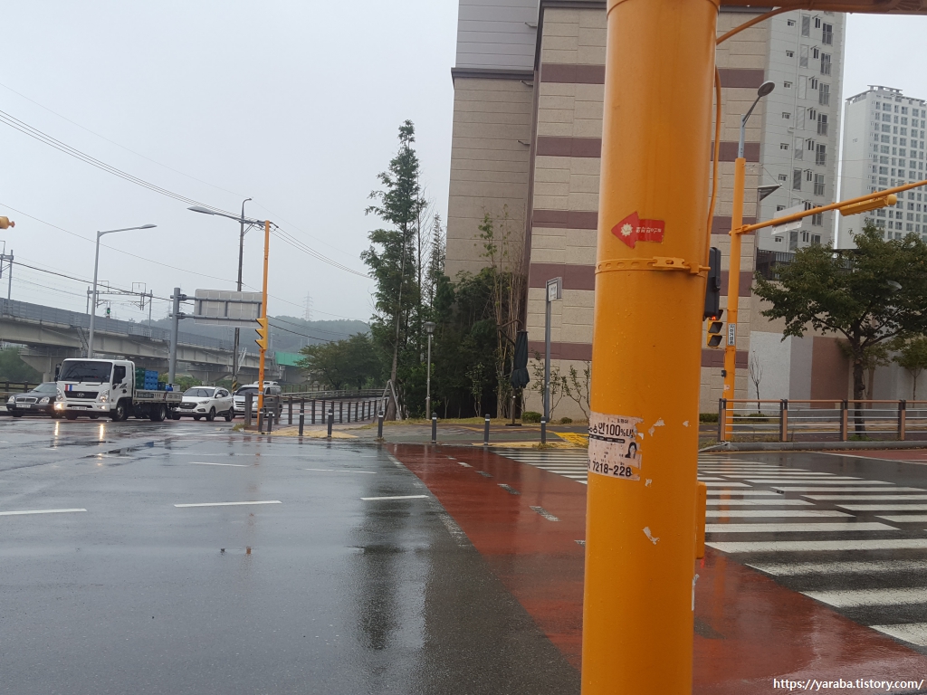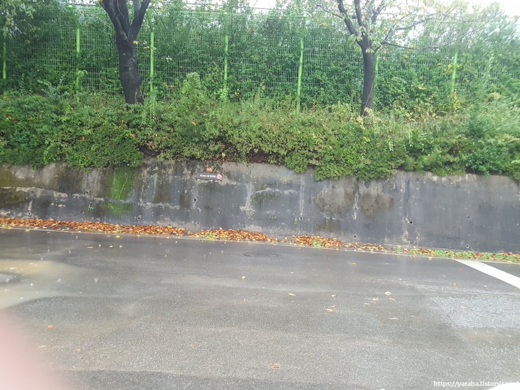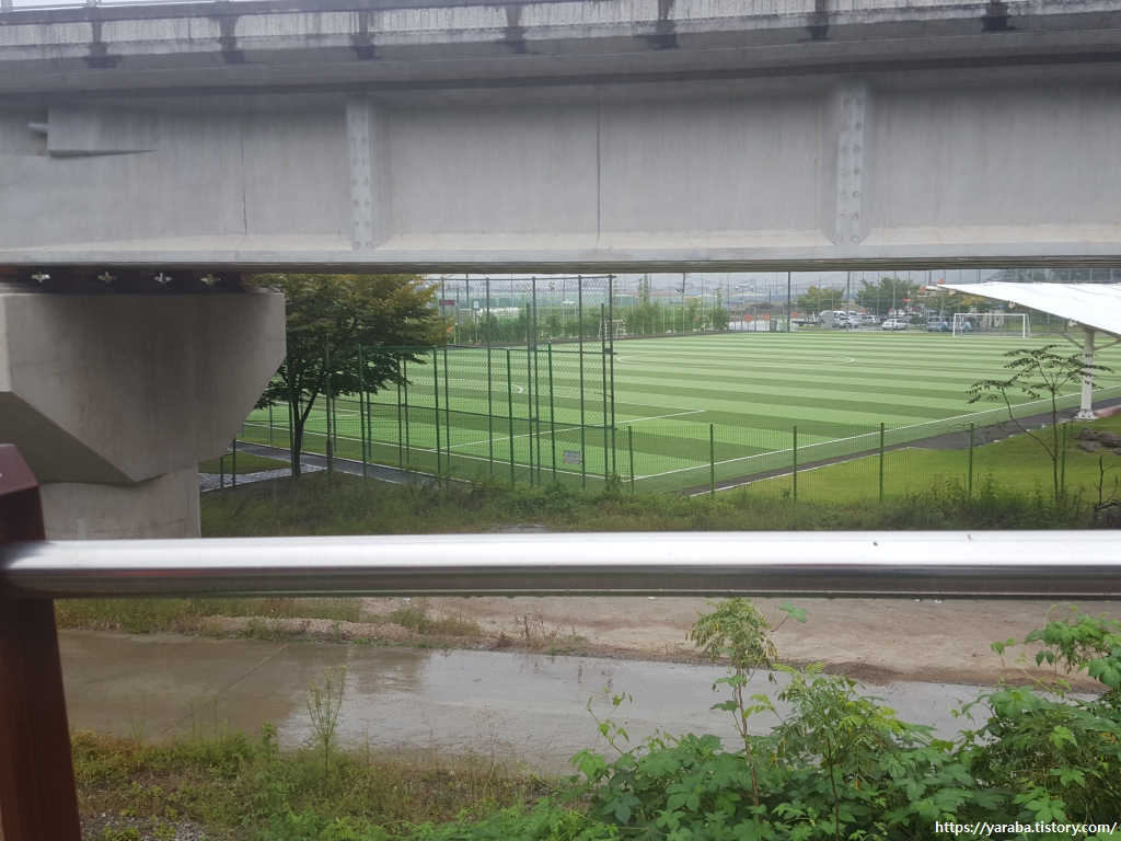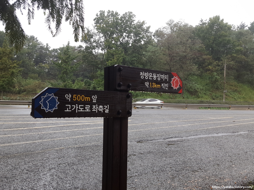 청량 운동장 앞. 이제 목적지까지 1.7Km가 남았다. 비에 젖고 지친 몸을 빨리 쉬게 하고 싶다.