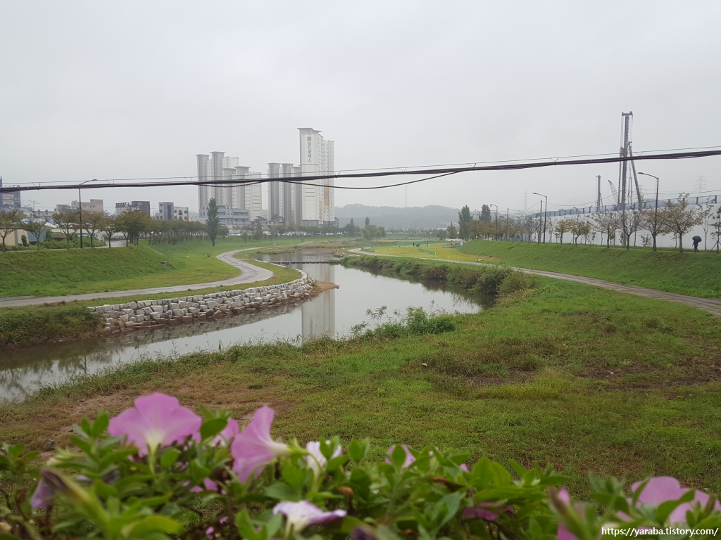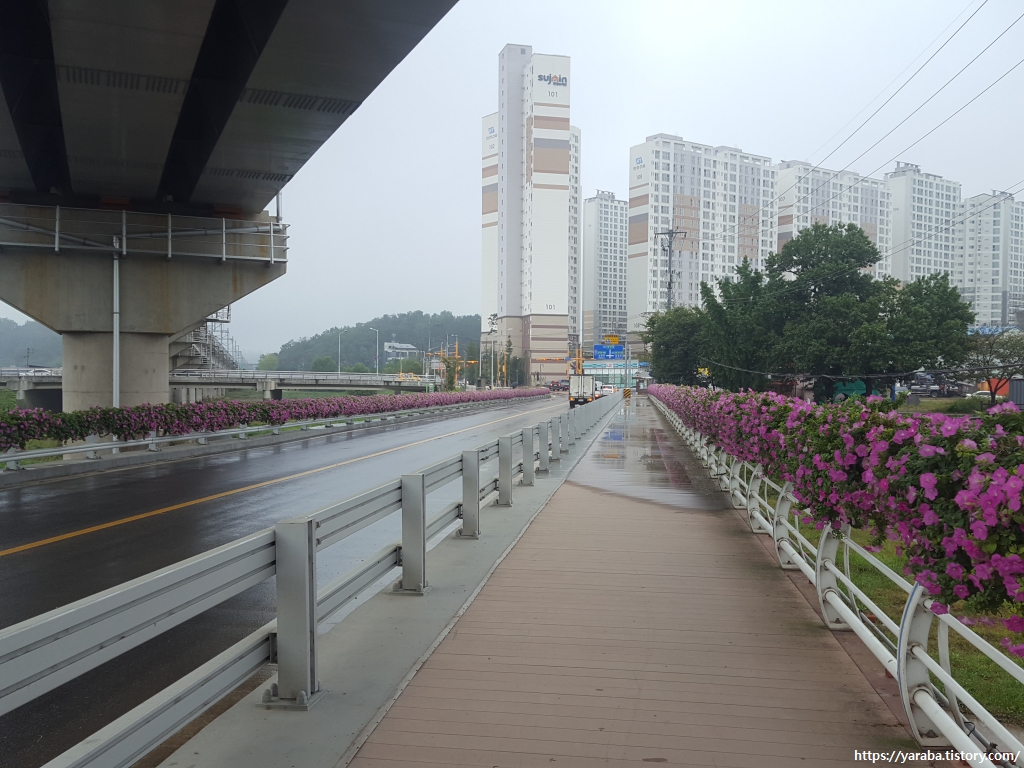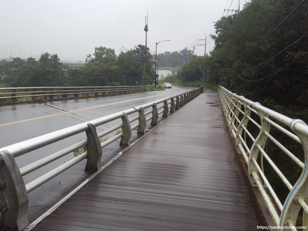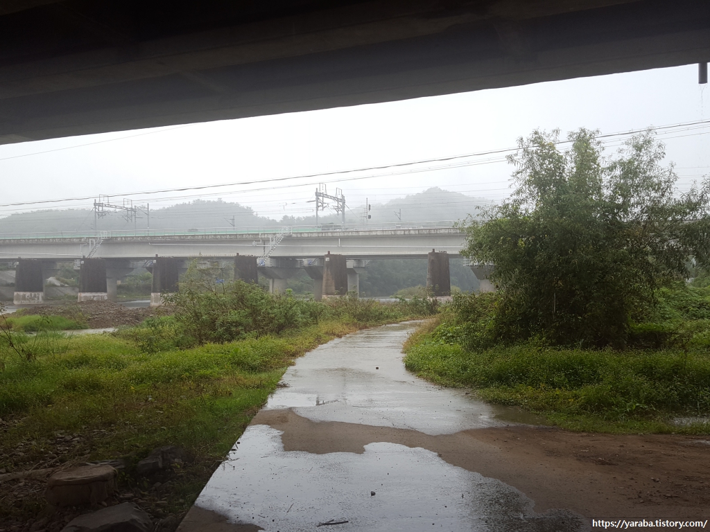 청량 운동장 앞. 이제 목적지까지 1.7Km가 남았다. 비에 젖고 지친 몸을 빨리 쉬게 하고 싶다.