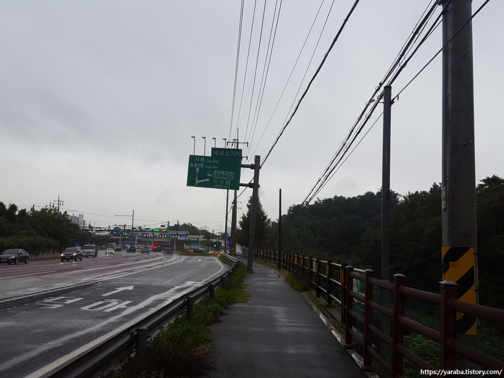14번 국도를 만나면 우회전하여 국도변 인도를 통해 길을 이어간다. 얼마 가지 않아 제네 삼거리를 만나는데 삼거리에서는 우측의 덕하로로 가면 된다.