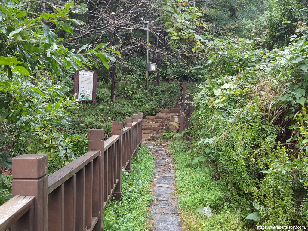 선암 호수 공원의 호수 공원길을 따라가던 해파랑길은 보현사 입구 근방에서 좌회전하여 위의 그림과 같은 계단을 통해서 급격히 고도를 올린다.