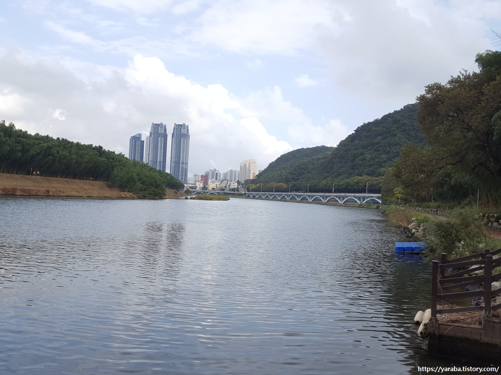 전망대 앞 강변에서 바라본 태화강 모습. 1997년 울산광역시로 승격할 당시만 해도 태화강은 5등급 수질의 악취가 풍기고 물고기가 떼죽음을 당하는 공업화의 결과를 그대로 표현하는 강이었지만 지자체는 하수관 정비, 퇴적 오니 준설, 수중 및 수변 정화 사업을 수행하고 기업들은 환경 설비 개선에 막대한 투자를 감행하여 2017년에는 1등급 수질을 회복하여 연어, 황어, 은어가 돌아오는 강이 되었다고 한다. 잘 사는 나라라는 것은 이런 것을 두고 하는 말이 아닐까 싶다. 쓰레기와 오염 물질이 쌓여도 살기 바쁜 탓에 모른 척 지나갈 수밖에 없는 후진국이 아니라 생각과 의지만 있으면 환경을 바꾸어 갈 수 있는 나라, 이것이 잘 사는 나라의 증거이지 않은가 하는 생각이 들었다.
