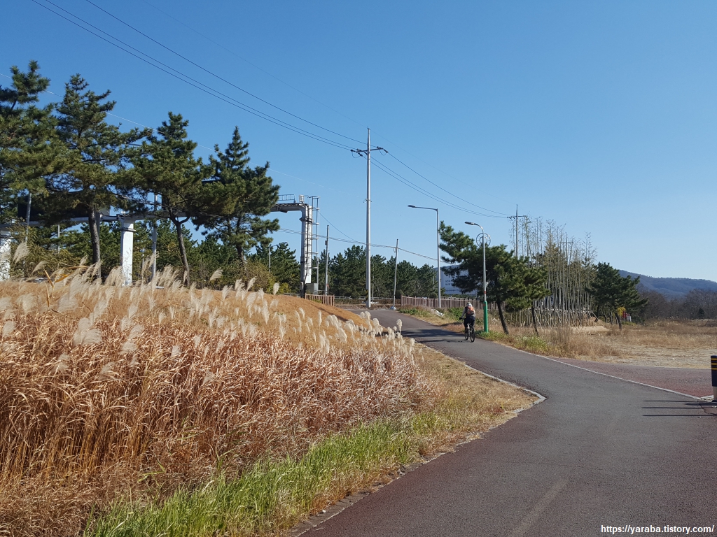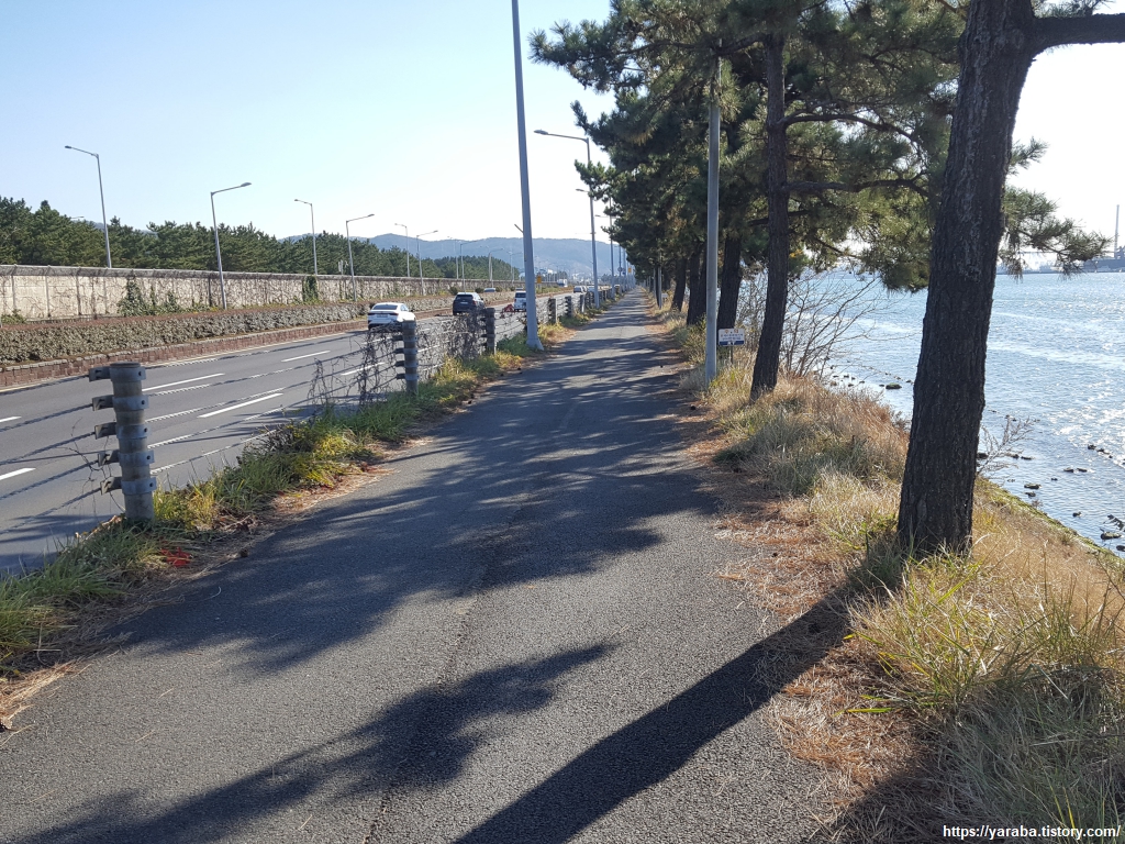 아산로 옆의 자전거, 보행자 겸용 도로는 가드레일도 있고 많은 구간이 차로보다 높게 만들어져 있어 걷기에는 안전한 길이다. 소나무와 바다 바람을 맞으며 걷는 길이다.