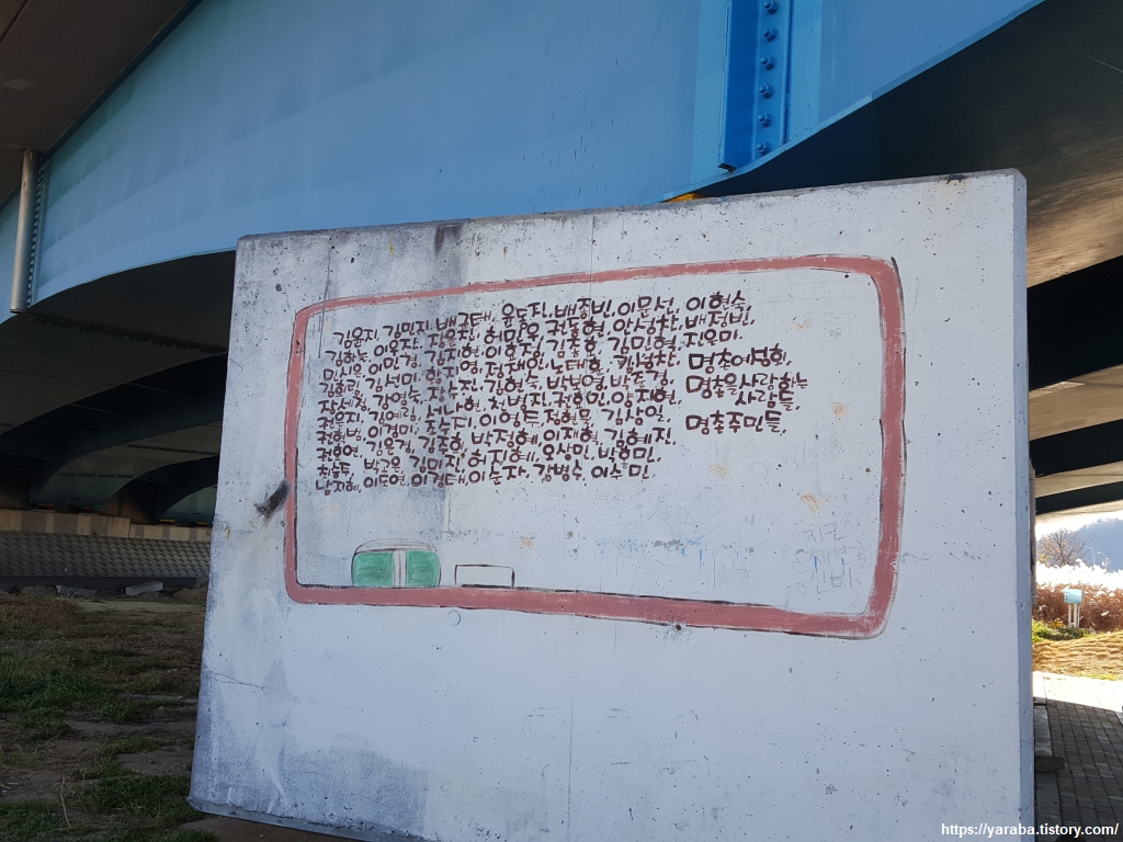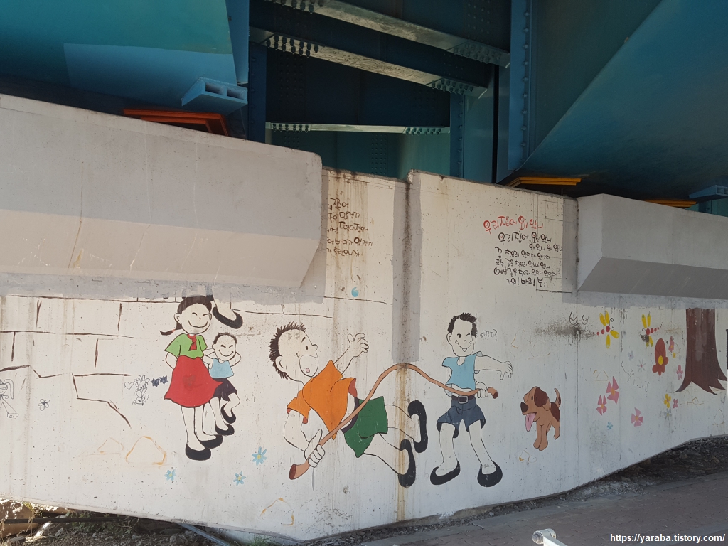 내황교를 지난 다음 U턴하여 강변 산책로로 진입하려면 내황교 아래를 지나야 하는데 다리 교각에 그려진 낙서와 같은 그림들이 정겹게 눈에 들어온다. 어린 시절 동네에서 놀던 노랫소리가 귀에 들리는 듯하다. 남자아이들은 주로 짬뽕 야구나 비석 치기, 오징어 놀이, 땅따먹기, 구슬치기, 딱지치기, 말뚝박기 놀이를 했지만 동네를 울리는 여자 아이들의 노랫소리는 아직도 귀에 생생하다.