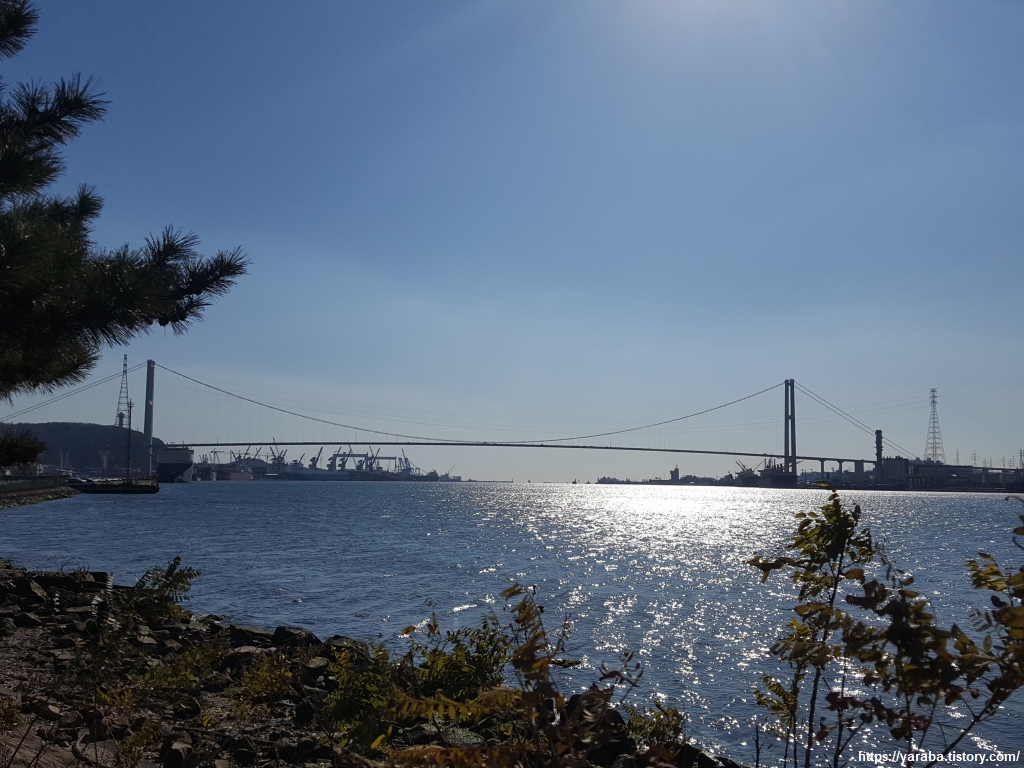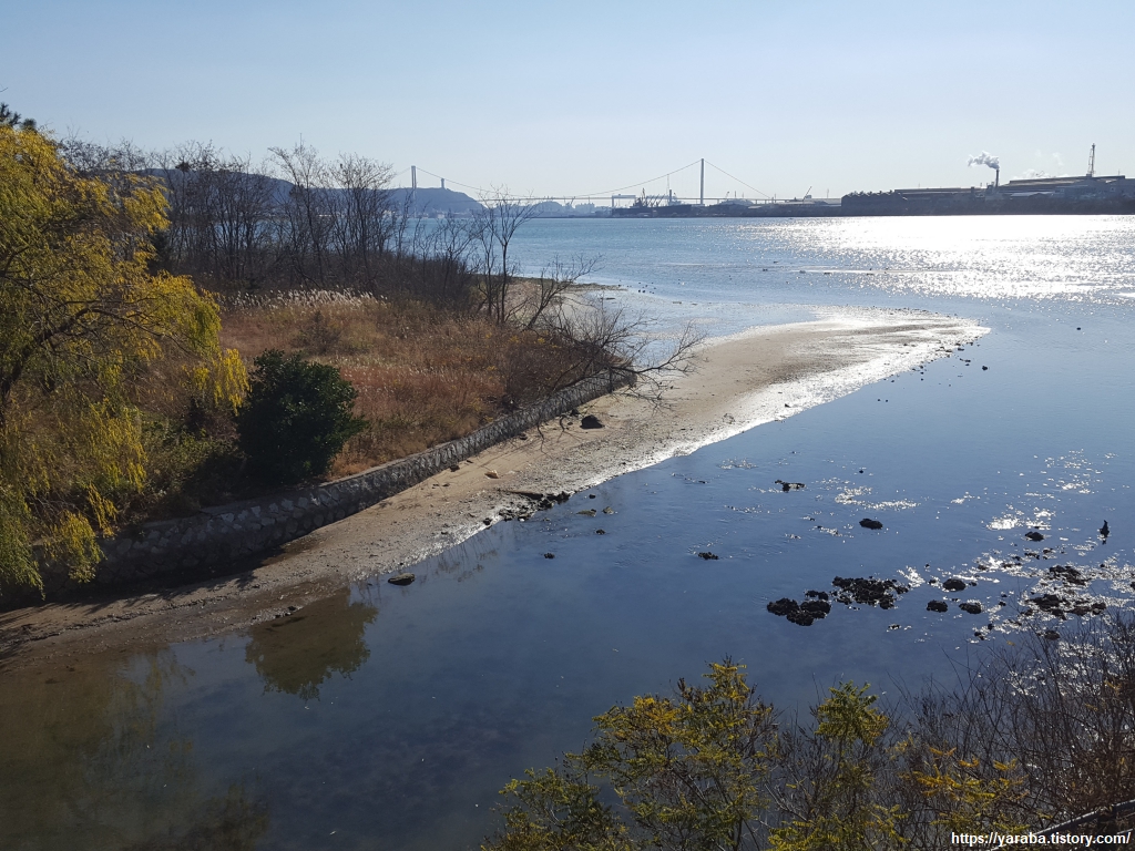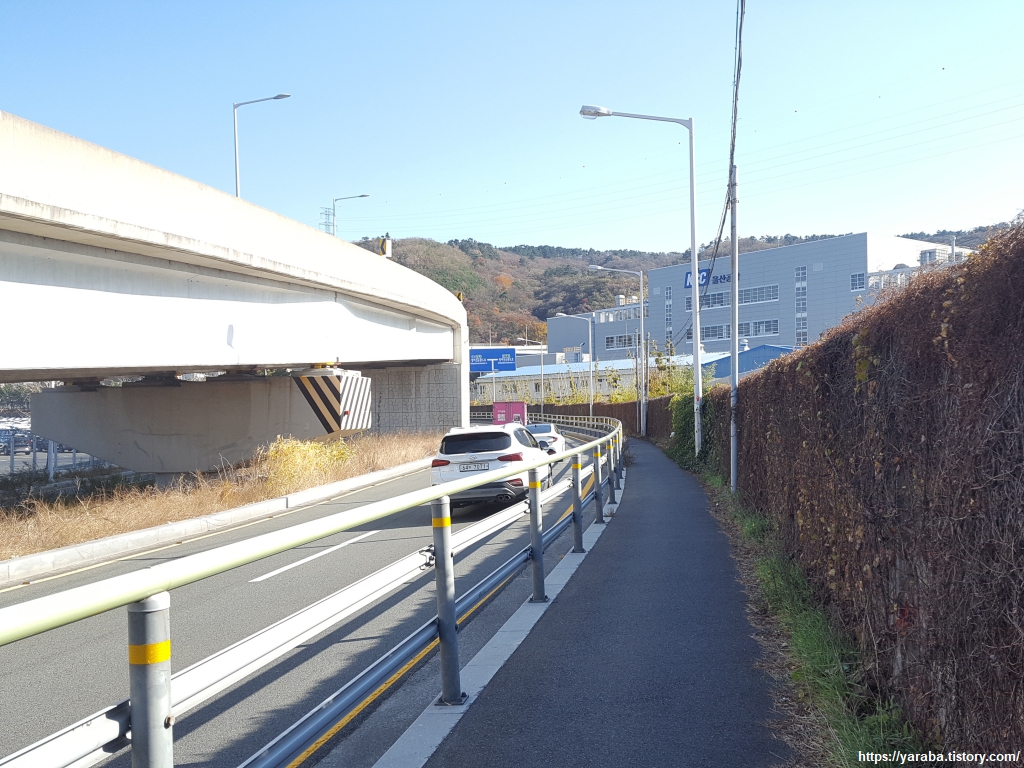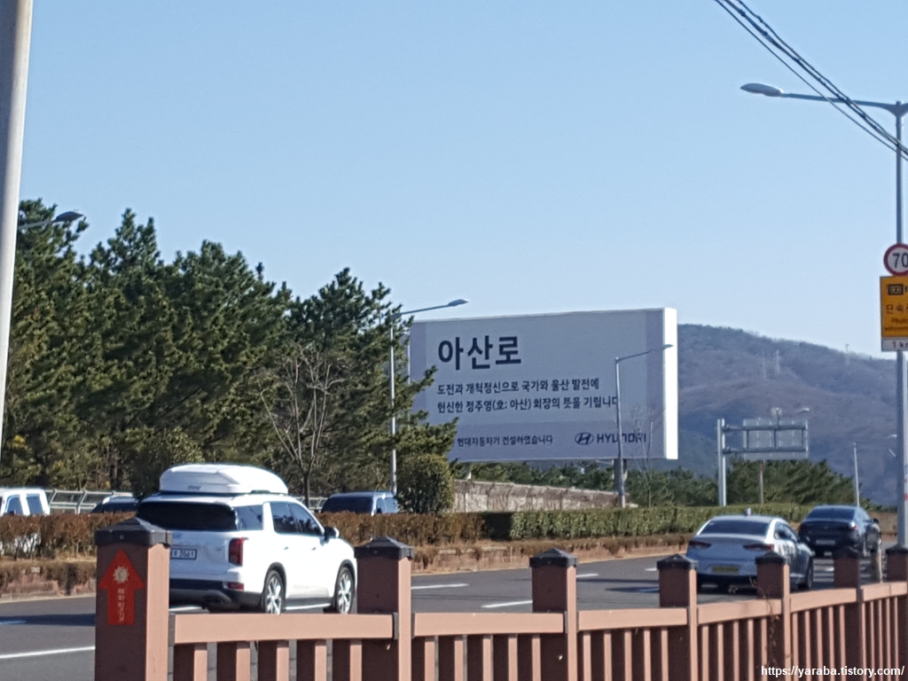 해파랑길은 태화강의 산책길을 벗어나 아산로의 도로변 자전거, 보행자 겸용 도로를 따라 걷는다. 왕복 6차로의 도로변을 걷는 길이므로 자동차 소음은 어쩔 수 없지만 바다와 인접한 태화강 하류를 보면서 걷는 재미도 쏠쏠하다. 1996년 완공된 아산로 안내판에 정주영 회장에 대한 언급이 있지만 이 도로의 개설은 1975년으로 거슬러 올라간다. 현재의 도로가 되기까지 20년이 걸린 셈인데 결론적으로 지자체는 도로의 경로를 변경해주고 현대자동차는 건설 후 기부채납 하는 방식으로 합의를 이루었다. 2015년 염포산 터널이 개통되면서 아산로에서 오늘의 목적지인 울산 동구까지 쉽게 갈 수 있는 경로도 생겼다.