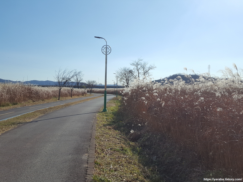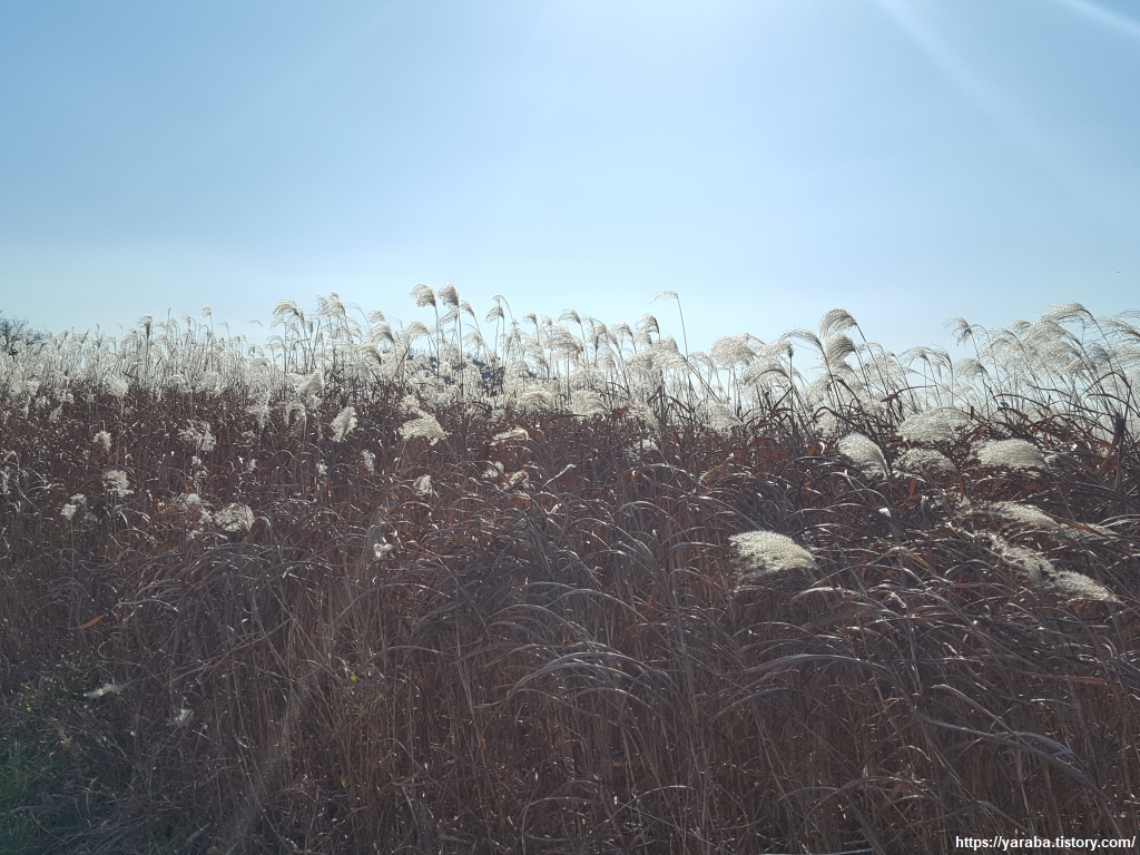 억새 군락지를 지나는 산책길. 겨울 햇살을 받은 억색의 이삭이 더욱 희게 보인다.