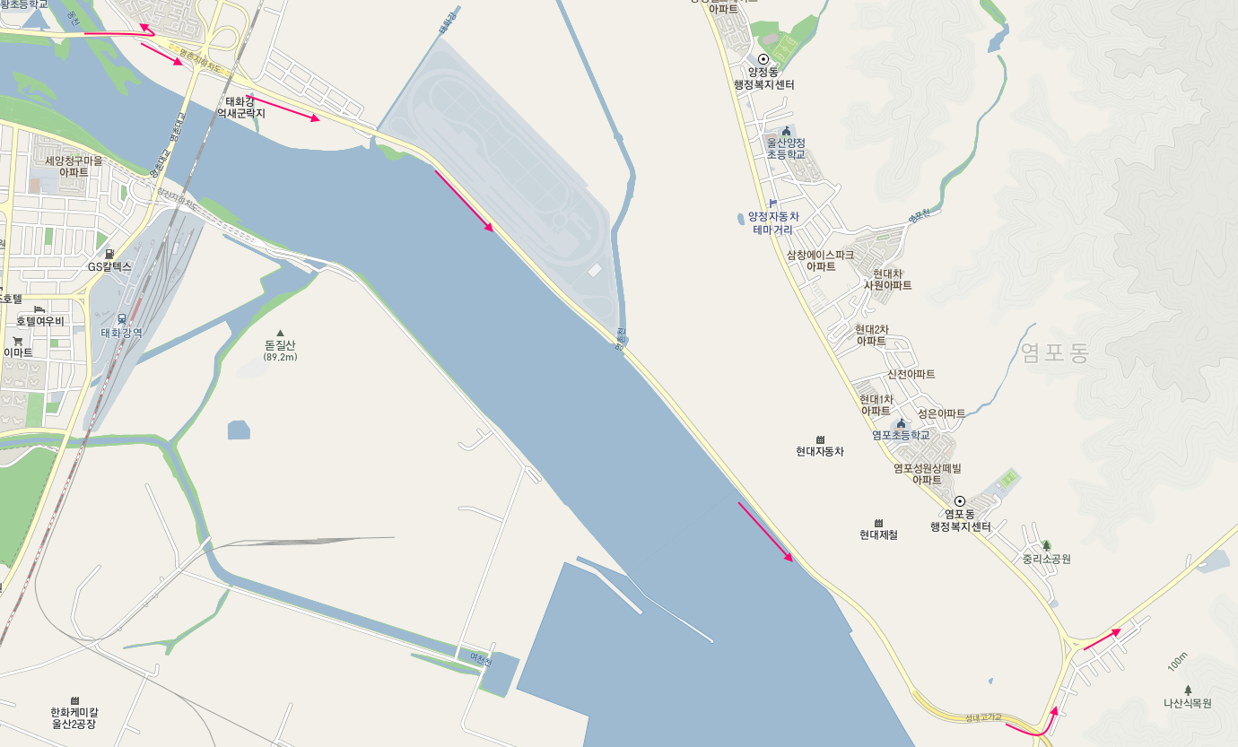 태화강변의 산책길을 걸어온 해파랑길 7코스의 나머지는 내황교를 건너자마자 좌측으로 U턴하여 강변으로 진입하는 것으로 길을 이어간다. 태화강 강변의 억새 군락지를 지나면 아산로를 따라서 도로변 산책길을 통해 7코스 종점인 염포산 입구까지 걷는다.
