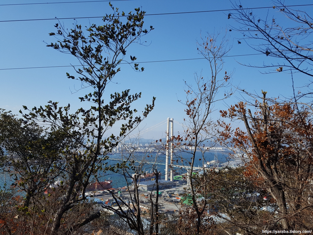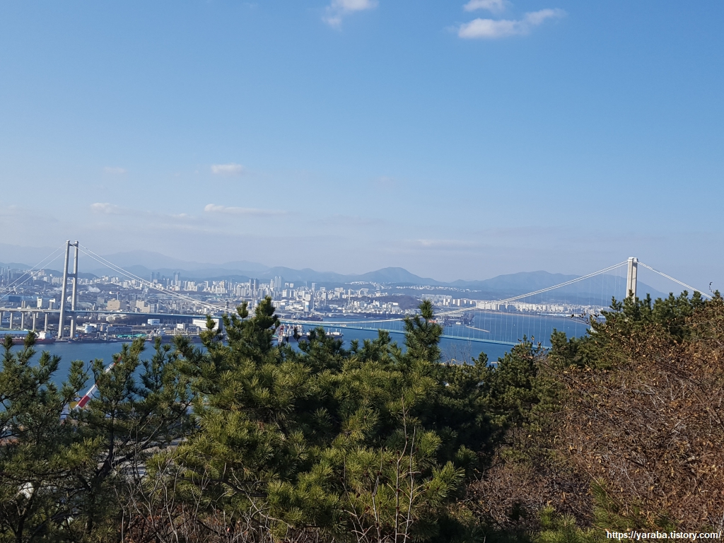 등산로 앞쪽으로는 울산 동구의 아파트 단지들이 보이고 길 우측으로는 울산 대교가 점점 더 가까워 보인다.