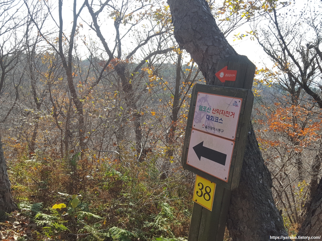 벚꽃이 피는 매년 봄이면 울산 동구청에서는 이곳 염포산에서 산악자전거 대회를 개최한다고 한다. 산악자전거 코스를 번호와 화살표로 안내하고 있다. 염포산 MTB 코스는 대부분이 추월할 수 없는 등산로를 가는 싱글 코스라고 한다.