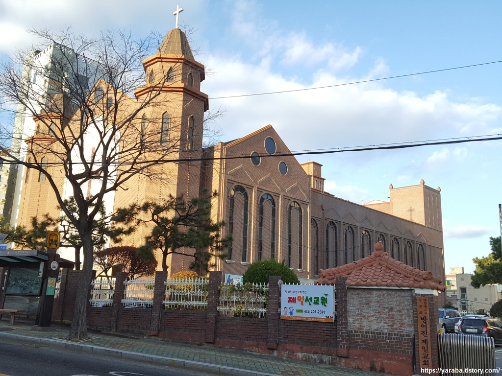 지나는 길에 이게 뭐지? 하면서 궁금증을 유발했던 건물. 건물의 모양은 유럽의 대형 성당을 연상시키는데 과연 무엇일까? 했는데 성당이 아니고 개신교 교회인 방어진 제일 교회의 모습이었다. 역사는 1920년대로 거슬러 올라가고 두 아들의 순교와 함께 자신도 순교했던 손양원 목사가 전도사로 시무했던 교회라고 한다.