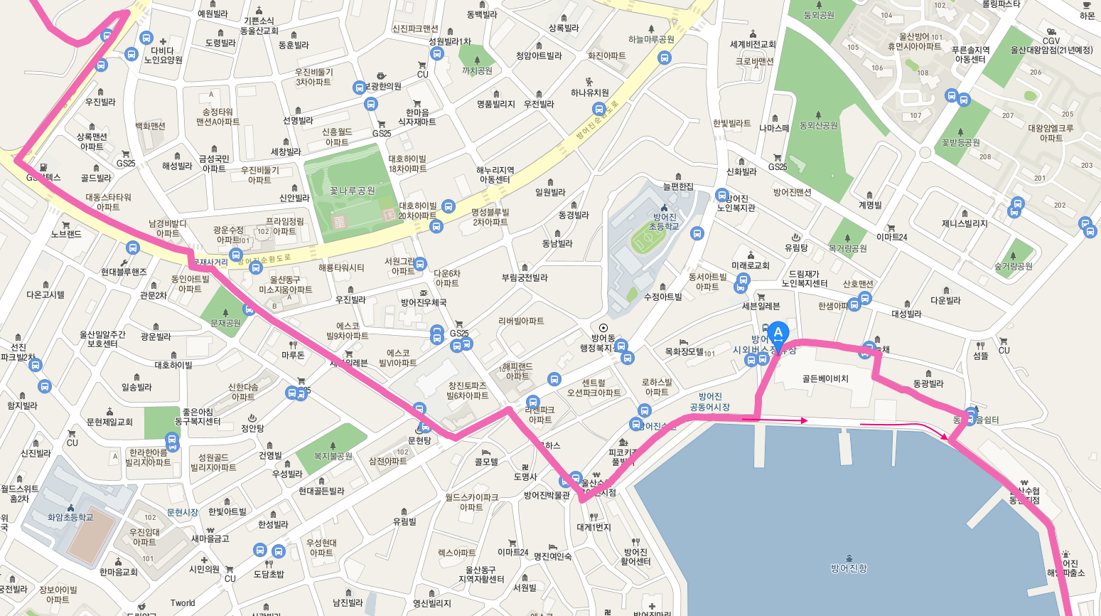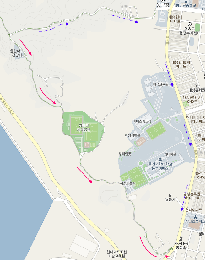 일단 산을 따라 내려오는 봉수로에서 방어진 순환도로를 향해서 남쪽으로 내려간다. 울산 동구를 남북으로 달리는 방어진 순환도로를 만나면 좌회전한다.
