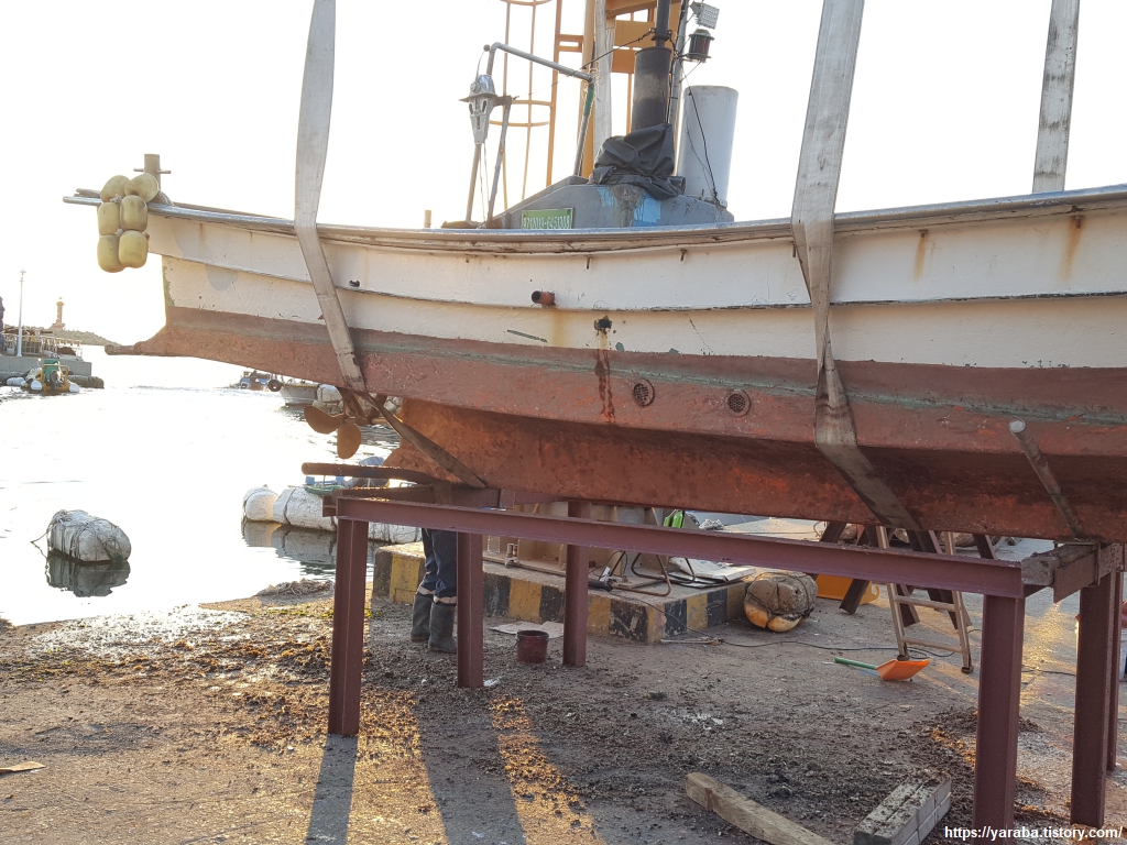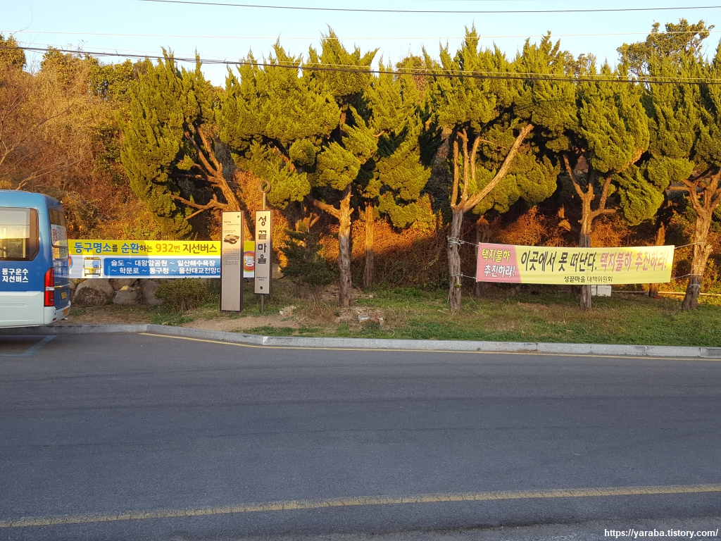 방어진항 끝에서는 길로 나가서 동진항을 돌아가는 성끝마을을 진입한다. 성의 끝에 있다 해서 붙은 이름 성끝마을은 벽화 마을로도 유명하지만 개발의 소용돌이 속에서 아픔이 있는 모양이었다. 근처 대왕암 공원 조성 사업으로 전국에서 사람들이 몰려들고 그에 맞추어 지자체는 주차장이나 광장 등을 조성하는 과정에서 갈등이 있는 모양이었다. 성끝마을의 90% 이상이 국유지라니 소유권을 주장할 수도 없는 이들의 아픔이 있다. 동진항은 방어진 구석에 있는 작은 어항으로 작은 배들이 정백해 있는데 이곳도 매립 예정이라 한다. 개발의 광풍 속에서 이곳은 또 어떤 모습으로 바뀔지...... 뭍에 올려져 정비를 앞두고 있는 작은 선박의 모습이 이곳 사람들의 처지인 것 같아 쓸쓸해 보인다.