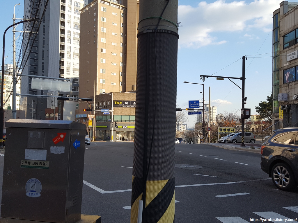 문재 사거리를 만나면 횡단보도로 방어진 순환도로를 건너고 대각선 방향으로 내리막 길을 걷는다.