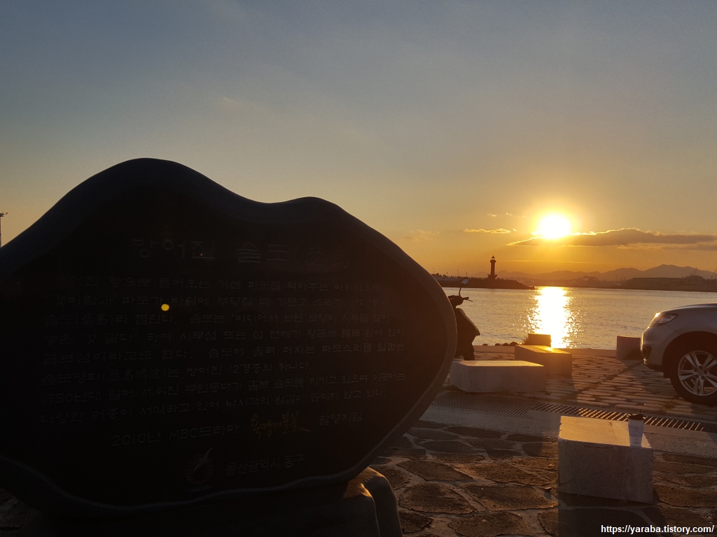성끝 마을 앞에 있는 슬도의 모습이다. 방어진항의 방파제 역할을 하는 무인도로 성끝 마을에서 슬도까지 둑이 있어서 걸어서 들어갈 수 있는 섬이다. 슬도는 파도가 치거나 바람이 불면 거문고 소리가 난다 해서 붙은 이름이라도 한다. 동해에서 일몰을 제대로 감상할 수 있는 장소이다. 바다를 배경으로 일출과 일몰을 모두 볼 수 있는 몇 안 되는 장소이다.