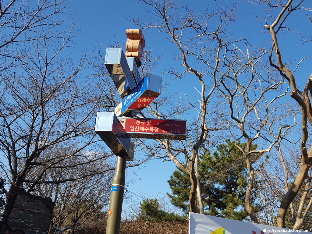 울산대교 전망대 앞 데크에서 울산의 광활한 풍경을 감상한 우리는 바로 앞에 있는 체육 시설 벤치에서 잠시 숨을 돌렸다. 옆지기는 그동안 걷기하며 자주 만났던 초대형 훌라후프를 돌려 보겠다고 나선다. 이곳은 화정산 삼거리라 부르는 곳으로 해파랑길은 해안을 따라서 울산대교 전망대를 지나서 가야 했다. 그런데, 우리는 오늘의 목적지인 "일산 해수욕장" 표지판을 따라서 울산 동구청으로 내려가고 말았다. 해파랑길 순방향 색상인 빨간색 표지판 때문이었을까? 내년 1월까지 공사 중인 전망대로 가는 걸음을 내딛는 것이 부담되었을까? 아니면 초대형 훌라후프를 돌리느라 정신이 없었을까? 아마도 목적지인 일산 해수욕장 표지를 보고는 이 길이 맞다고 여겼나 보다. "화정천내 봉수대" 표지판을 따라가야 했다.