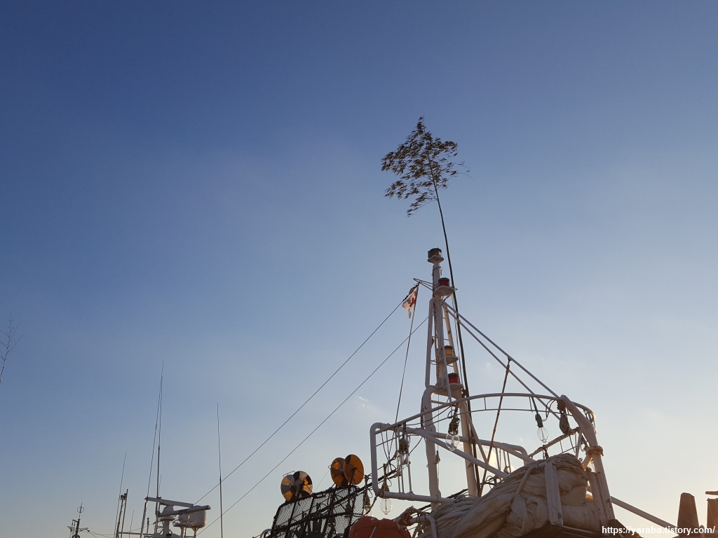 한 어선에 꽂혀있는 대나무 가지가 눈에 들어왔다. 풍어제에서 사용했다는 풍어기에 대한 해설을 보면 "대나무로 깃대를 만들고 길고 검은 천에 적·청·황·백의 가늘고 긴 기폭을 달고, 깃대 위에는 생대나무 가지를 꽂은 오색기"라고 하는데 왜 꽂았는지는 선장에게 물여 보아야 할 테고, 미루어 짐작해 보면 풍어나 안전을 위한 것이 아니겠는가?
