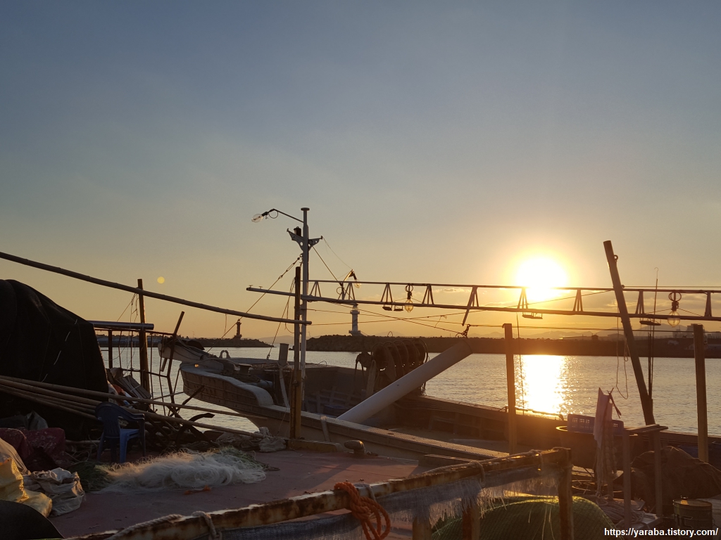 어선 위로 해가 내려간다. 이곳이 동해라는 것이 실감이 나지 않는 풍경이다.