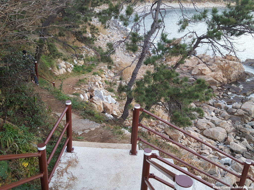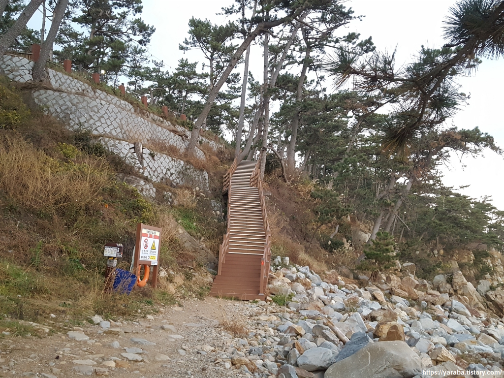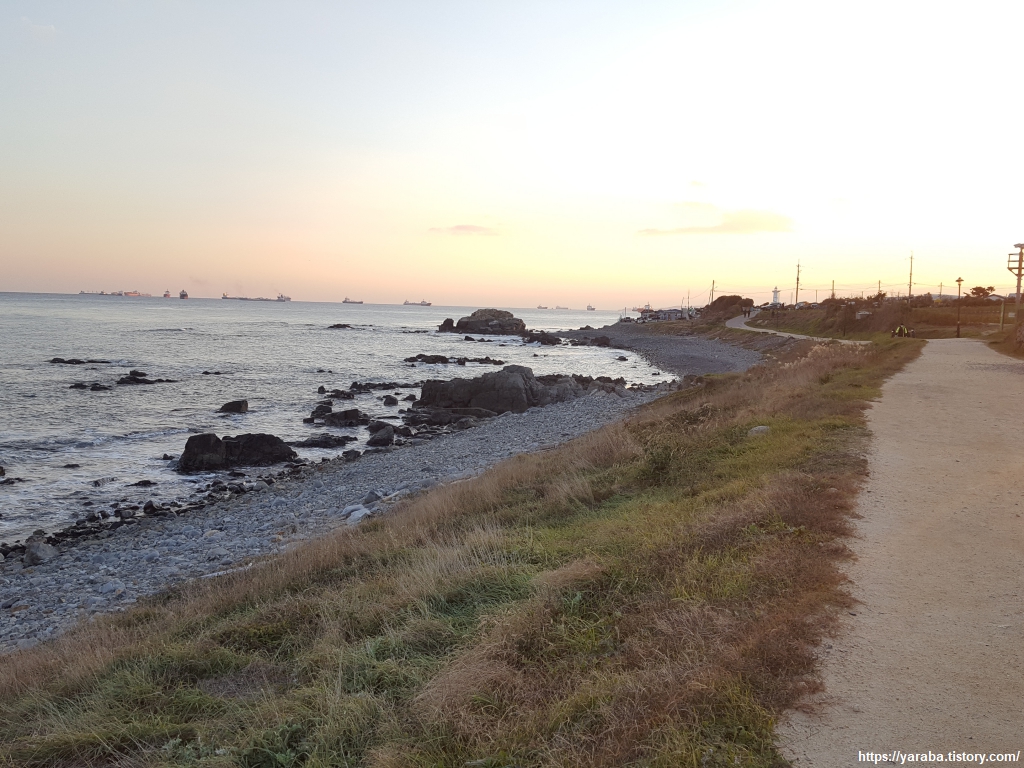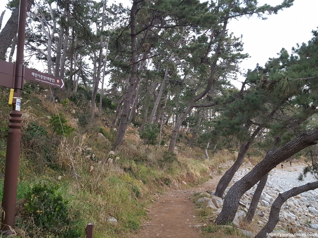 길은 성끝 마을에 있는 카페촌 아래의 해안길, 대왕암 공원 둘레길을 걸어간다. 지친 몸으로 자갈길 걷기는 쉽지 않다.