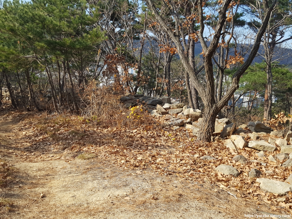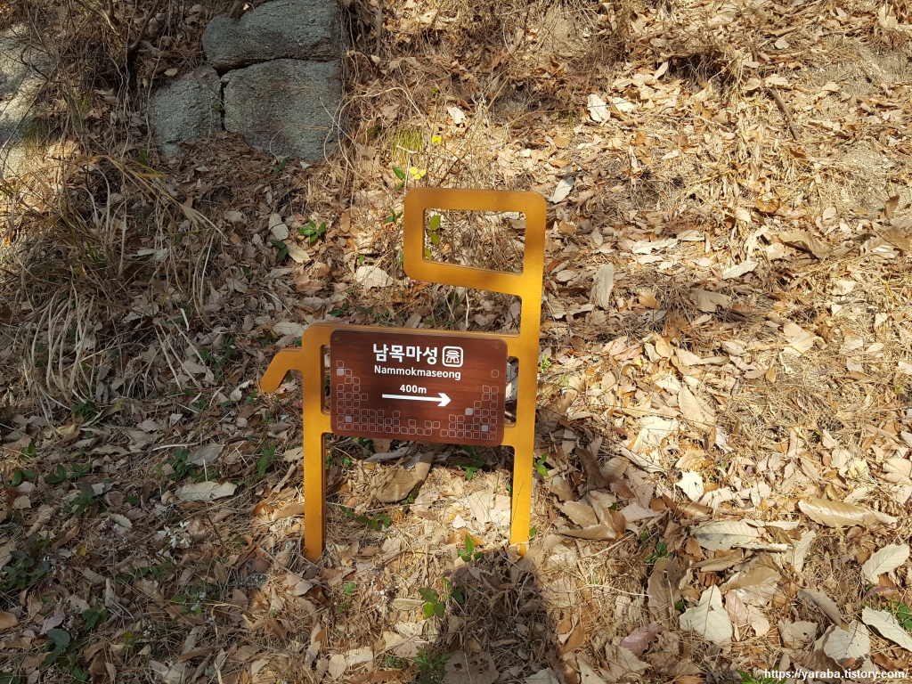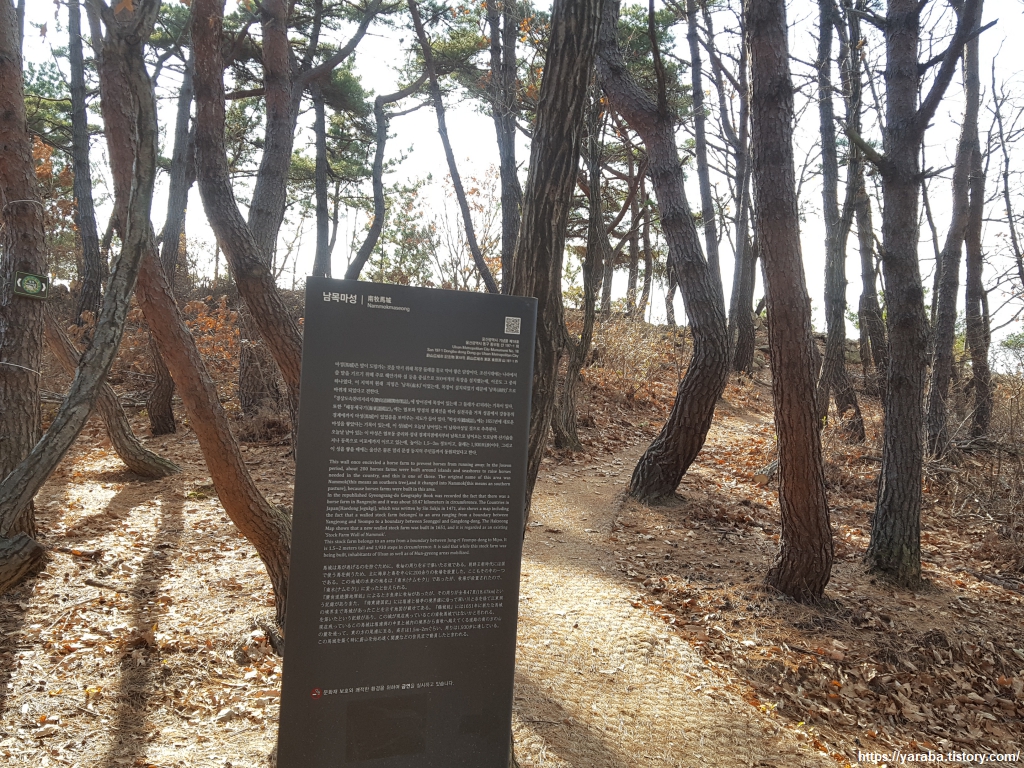 오르막 길을 오른 지 얼마 지나지 않아 돌무더기가 쌓여있는 남목 마성을 만난다. 원래의 길이는 5Km에 달하였다 하지만 지금은 그 일부만이 남아 있다.