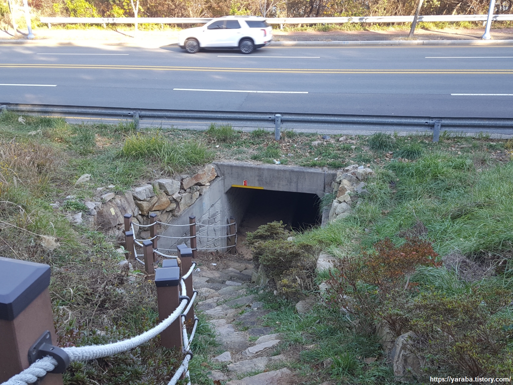 산 아래로 도로가 보이는데 산 너머 길을 시작할 때 만났던 마성 터널과 이어지는 미포 산업로라는 도로다. 해파랑길은 도로 아래의 굴다리를 통해 이어진다.