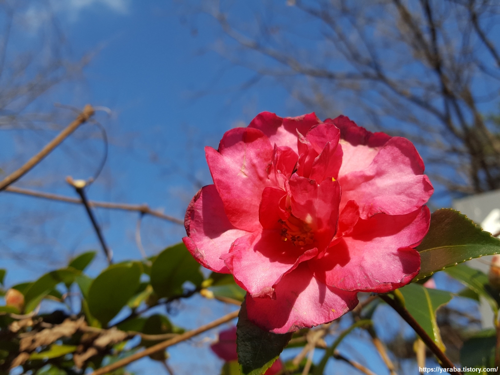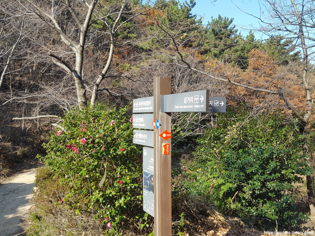 주전 가족 휴양지 표지판을 따라 길을 이어간다. 동백꽃이 자신의 때를 맞이했다. 보통 10월에 꽃이 피기 시작하여 2~3월에 절정에 이르고 4월까지 간다고 한다. 벌과 같은 곤충이 많이 없는 시기이기 때문에 동박새나 직박구리가 와서 꿀을 먹으며 수정한다고 한다.