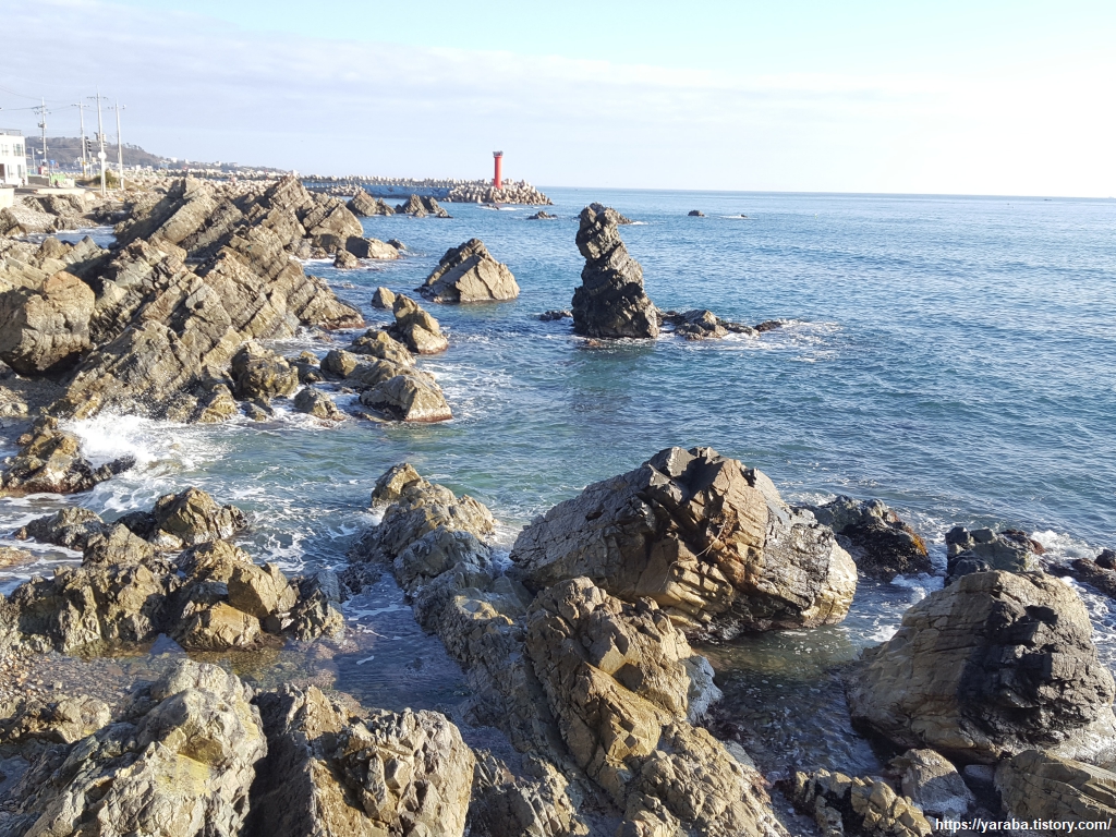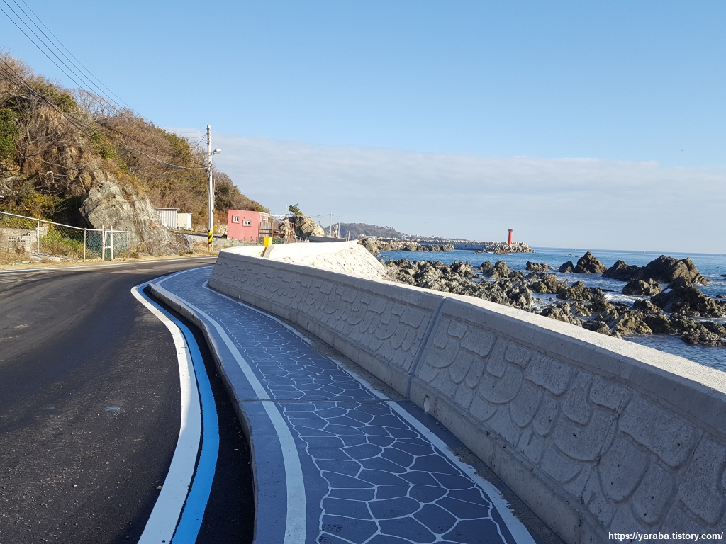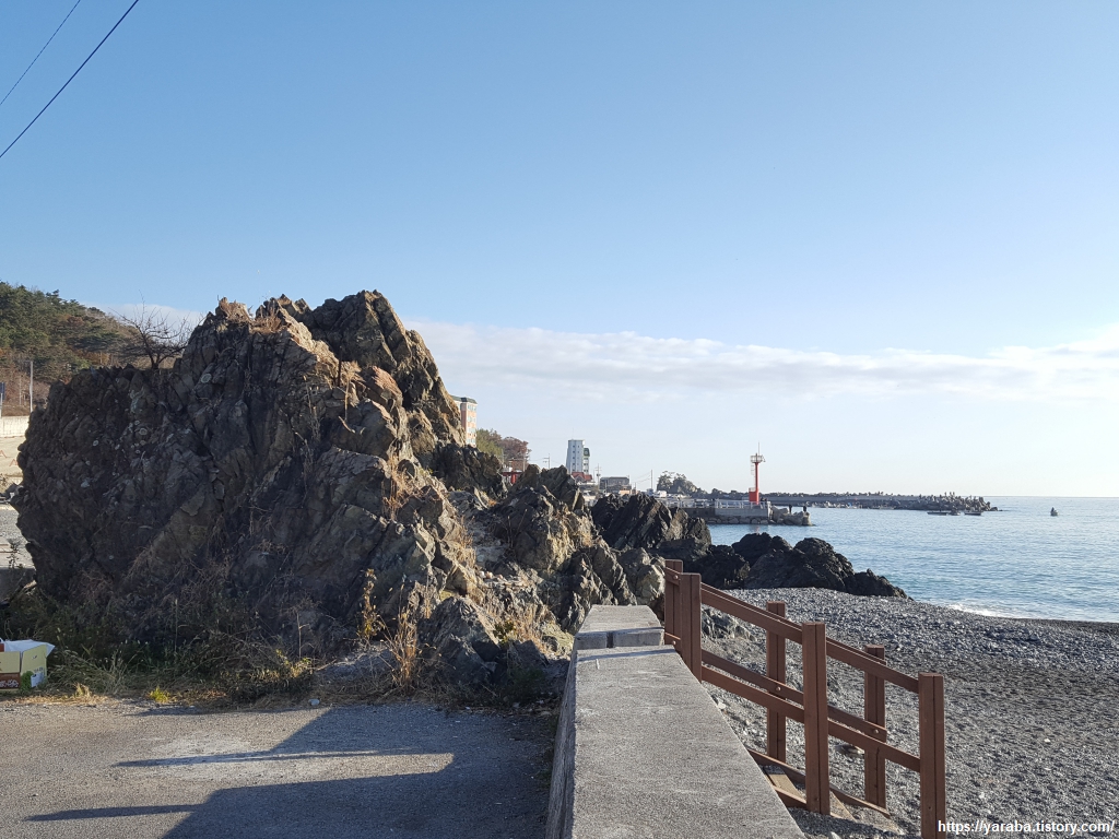 신명 방파제를 지난 길은 해안 도로를 따라 지경리로 향한다. 바닷가는 그야말로 기암괴석 천지다.