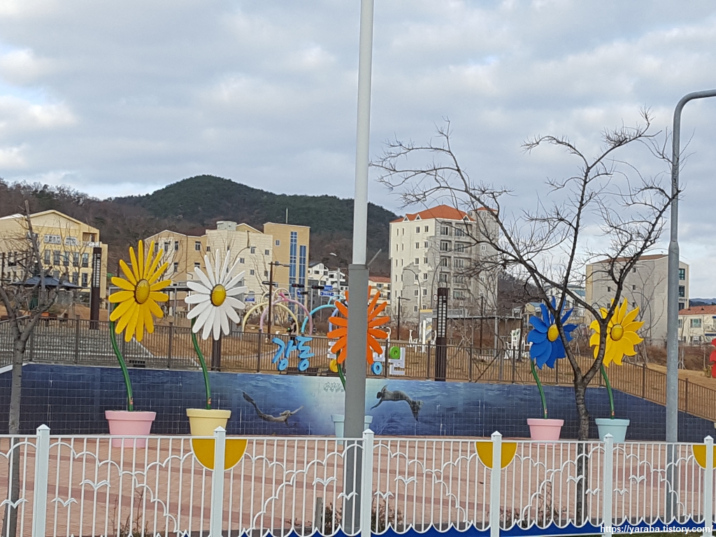 원래의 해파랑길 경로인 길로 돌아와서 본격적으로 10 코스 걷기를 시작한다. 꽃 모양의 조형물로 입구를 장식한 강동 중앙 공원 앞을 지난다. 바다를 보면서 산책할 수 있는 시민들의 휴식처이다.