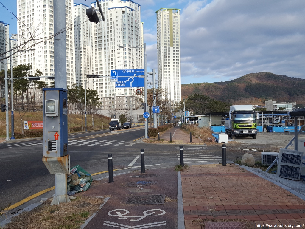 신명교를 건너면 화려한 아파트 단지들과도 안녕이고 이제는 평범한 어촌 마을로 진입한다. 산 쪽으로 산을 횡단하고 있는 다리는 31번 국도이다. 오늘 하루 걷기 할 동안 자주 만났다, 헤어졌다 할 도로다.