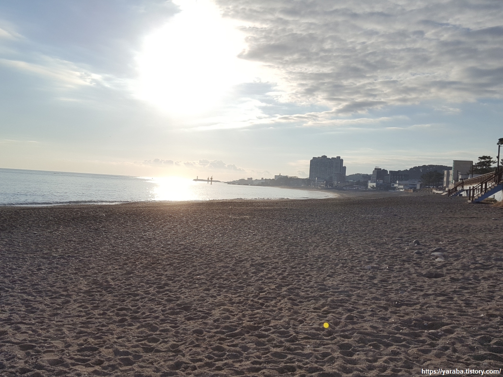 저 멀리 정자항의 등대가 보인다. 강렬한 아침 햇살과 깃털 구름, 마치 모래가 아닌가 싶은 같은 고운 몽돌밭이 절경을 이룬다.