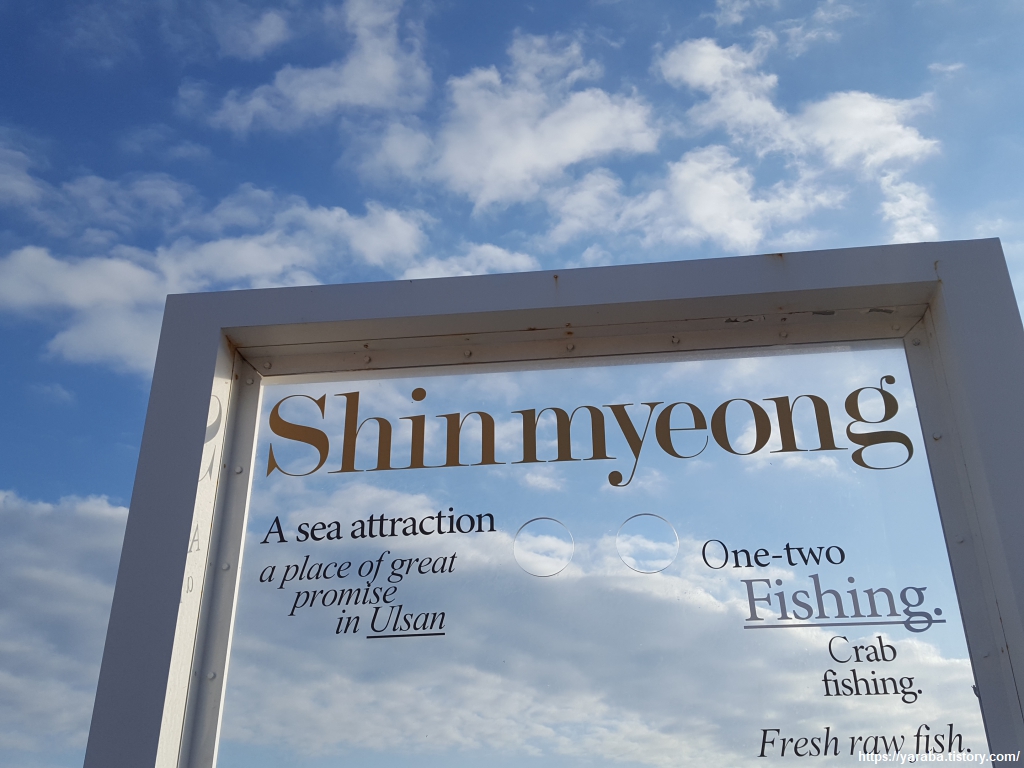 신명 해안에서는 원투 낚시로 성대를 잡는다고 한다. 원투 낚시는 멀리 던진다는 의미의 원투(遠投)인데 표지판에서는 재미있을라고 했는지 One-two Fishing으로 적어 놓았다.
