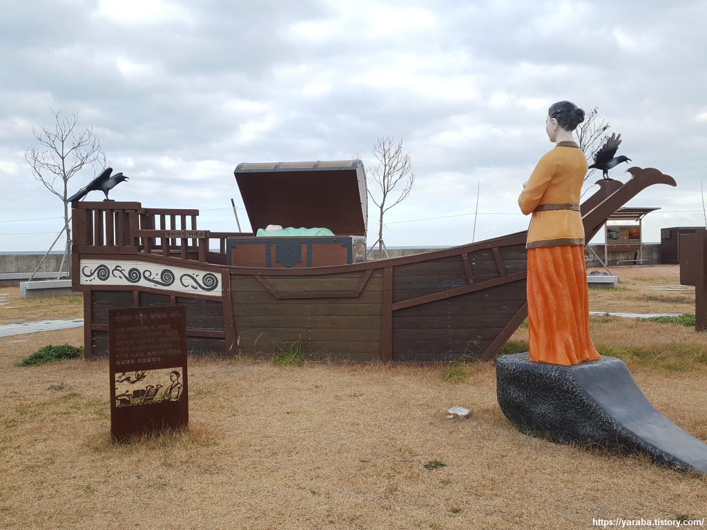 테왁을 짊어진 해녀 그림에서는 잠시 걸음을 멈출 수밖에 없었다. 바로 좌측 "설레이"라는 소녀 그림과 극한 대비를 이루고 있는데 굽은 허리를 가진 그림의 해녀도 갯바위에 앉아 봄꽃에 마음이 설레는 시절이 있었을 것을 생각하면 인생무상의 감정이 훅하고 들어온다.