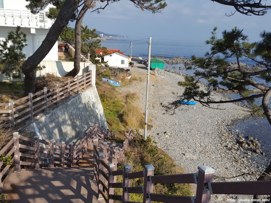 이곳에 다니러 오신 분들은 왔던 길로 돌아가지만, 해파랑길은 입구 건너편 계단을 내려가 척사로라는 해안길로 나아간다.
