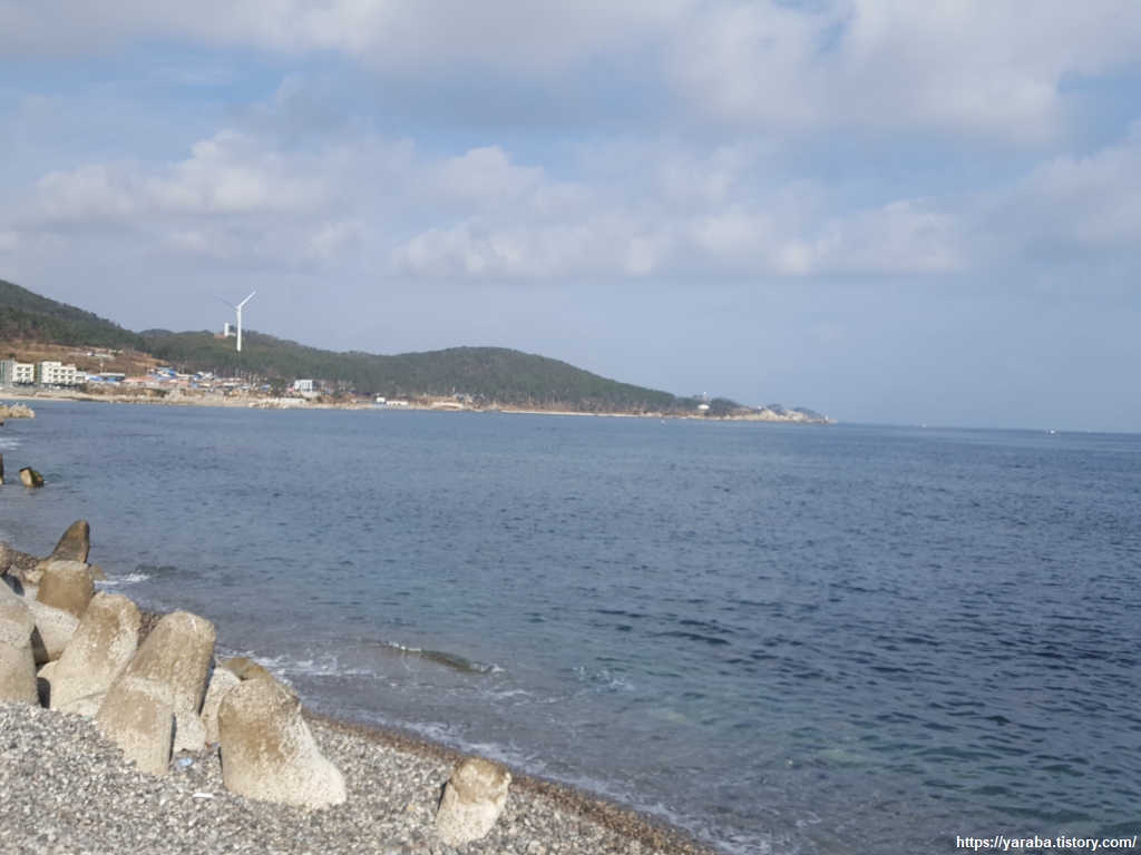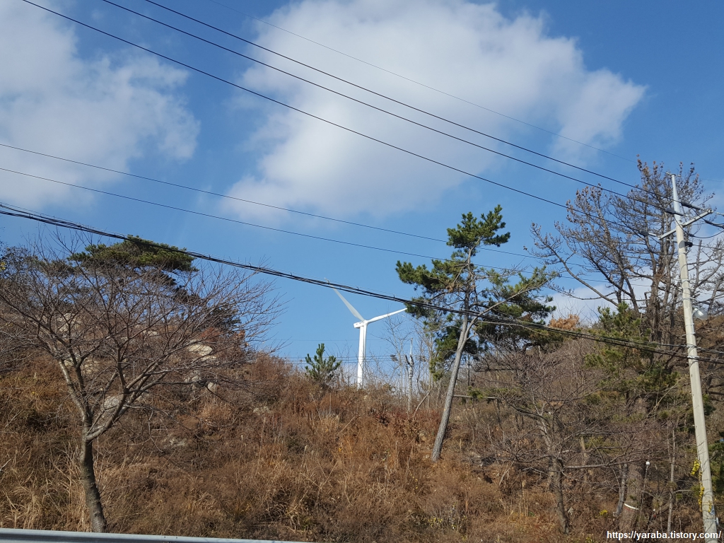 두원리 어항을 지나면 다시 31번 국도로 올라가서 도로변 길을 걷는다. 두원리에 있는 풍력 발전기는 개인사업자가 본인의 산림에 설치한 모양인데 처음에는 산림 훼손이 문제가 되었고, 최근에는 전력 판매가 문제가 된 모양이었다. 대형 풍력 발전기들은 소음과 저주파 발생 문제로 점차 바다로 나가고 있는 상황에서 소규모 사업자가 중형 풍력 발전으로 사업성을 내기란 여간 어렵지 않아 보인다. 한수원이 항구에 설치한 태양광, 풍력 하이브리드 발전기에 사용한 소형 풍력 발전기와 같은 소형 풍력 발전기도 기술 발전과 함께 많이 활성화된다면 소음 문제도 해결되고 좋지 않을까 하는 바람을 가져 본다.