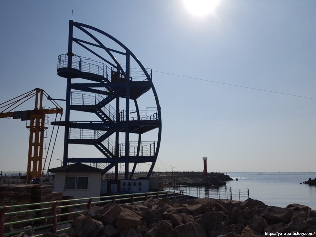 연동 어촌 체험 마을이 있는 연동 방파제의 모습이다. 고려 때 사람들이 이곳에 정착해 마을을 만들기 시작했는데 당시 연못에 연꽃이 많아서 연동이라 부르게 되었다는 이야기가 있다 한다. 방파제를 지나가면서 저 철구조물을 뭐하는 데 사용하는 것일까? 미역이나 무거운 것을 내리는 크레인은 바로 옆에 있는데 무엇에 사용하는 물건일까? 이리저리 보면서 한참을 궁금해했는데 알고 보니 마을 앞 방파제를 가로지르는 집라인이었다. 지금은 비수기라 공사 중이지만 성수기 때는 사람들이 많이 타는 모양이었다.