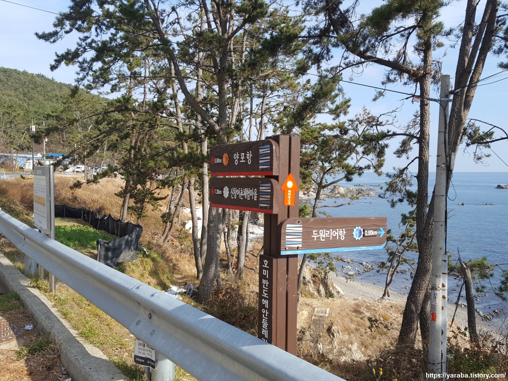 어항 뒤편에 있는 계단을 올라서 마을길로 들어서는데, 계단 끝에서 포항시에서 설치한 호미반도 해안 둘레길을 만난다. 상당 부분이 해파랑길과 같이 가는 길이다. 포항 도구 해안까지 이번 여행에서 자주 만날 표지판이다. 그런데, 이 표지판은 다 좋은데 한 가지 거리 표시가 없다는 점이 아쉽다.