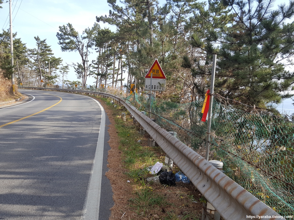 국도변을 얼마나 걸었을까, 전망 좋은 곳에서 왔던 길을 돌아본다. 멀리 연동 어촌 체험 마을이 가물거린다. 이 지역은 바닷가로는 군데군데 펜션들이 자리하고 있어 사유지 때문에 길을 도로변으로 걸을 수밖에 없는 모양이다. 도로변의 길도 비좁기 때문에 상당히 주의해서 길을 가야 한다.