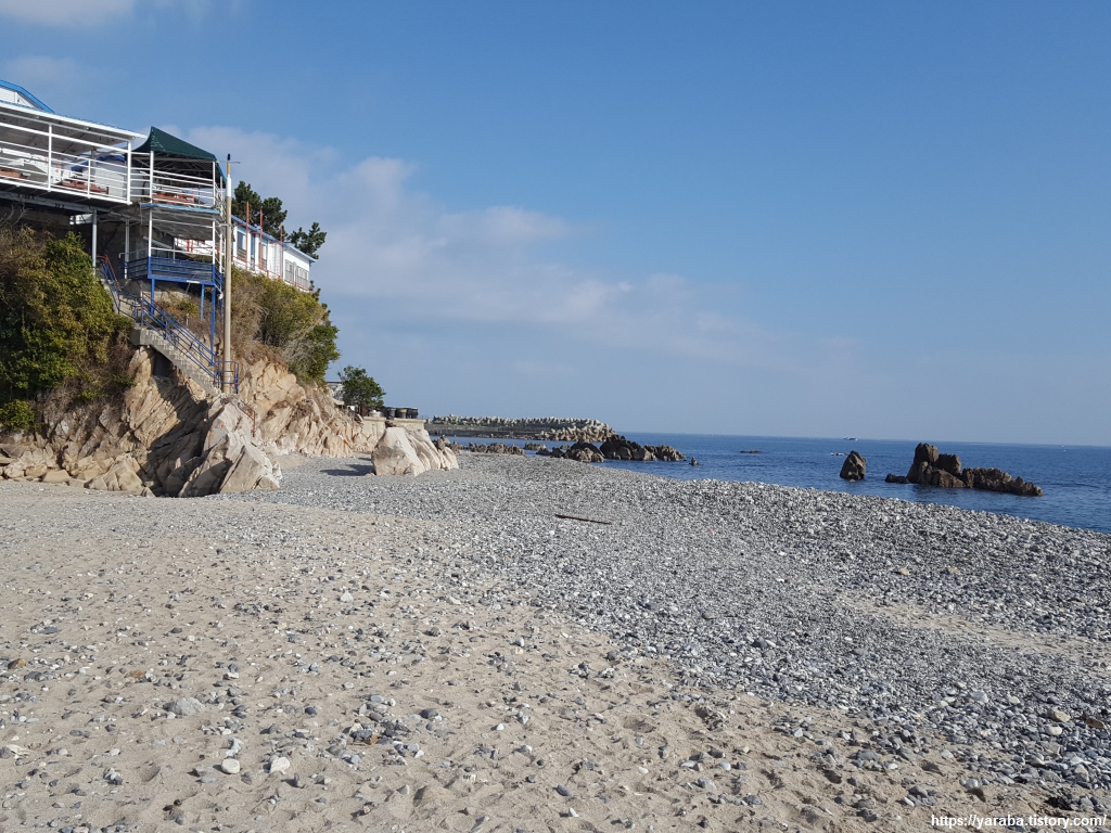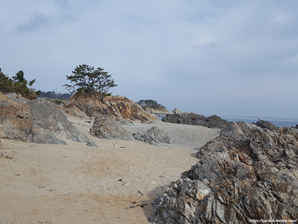 기존 해파랑길은 중간에 잠시 해안으로 내려갔다가 다시 국도로 올라오지만 지금은 대부분 어업지역이나 사유지라고 내려가고 올라오는 길을 막아 놓았으므로 계속 도로변을 직진하여 군부대를 지나서 자유롭게 출입할 수 있는 넓은 모래사장을 만날 때까지 걷는다. 이 해변 앞에 정자도 있으므로 쉬어 갈 수도 있다.