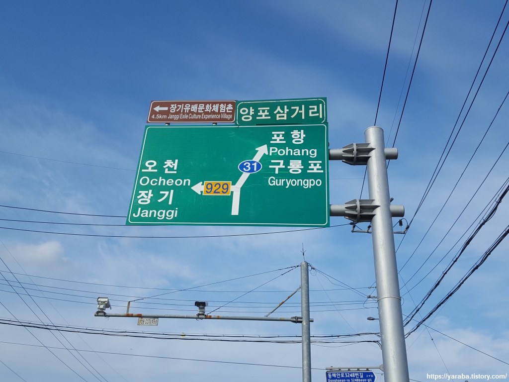 다시 31번 국도로 올라온 해파랑길은 원래 코스에는 양포 해수욕장으로 나갔다가 다시 돌아오는 길이 있지만 지금은 공사 중이라 막혀 있었다. 수성천을 건너는 양포교까지 직진한다. 그런데, 길 안내판에 "장기 유배 문화 체험촌"이란 문구를 보고는 처음에는 우스운 생각이 들기도 했다. 장기간의 유배 생활을 체험한다고? 알고 보니 이것은 완전히 초등학생 같은 상상이었다. 이곳의 지역 이름이 장기면이고 다산 정약용이 이곳에 유배 왔었다는 시대 배경, 고려 시대에 축성했다는 장기읍성이 체험촌에 같이 있다는 것까지 알고 나니 오호! 하는 호기심도 생길 정도였다.