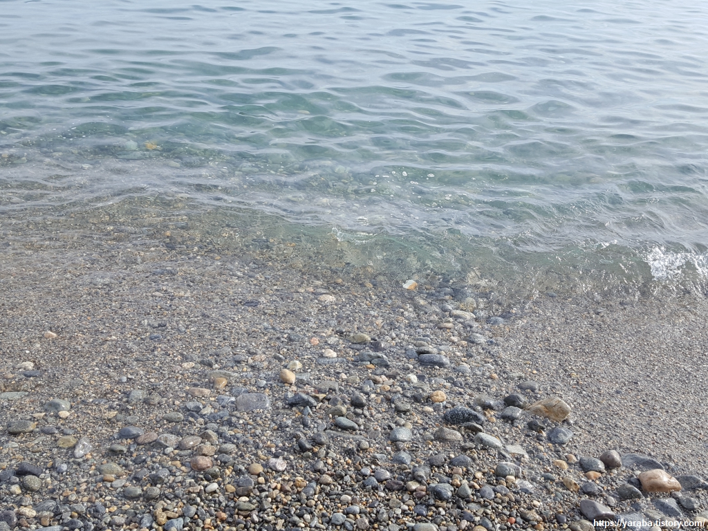 아슬아슬하지만 물가로 바싹 붙어서 걸으니 모래밭 걷기보다는 훨씬 좋다. 맑은 물을 보는 것도 좋고, 덤으로 몽돌 굴리는 소리도 가까이에서 들으니 1석 3조의 선택이었다.