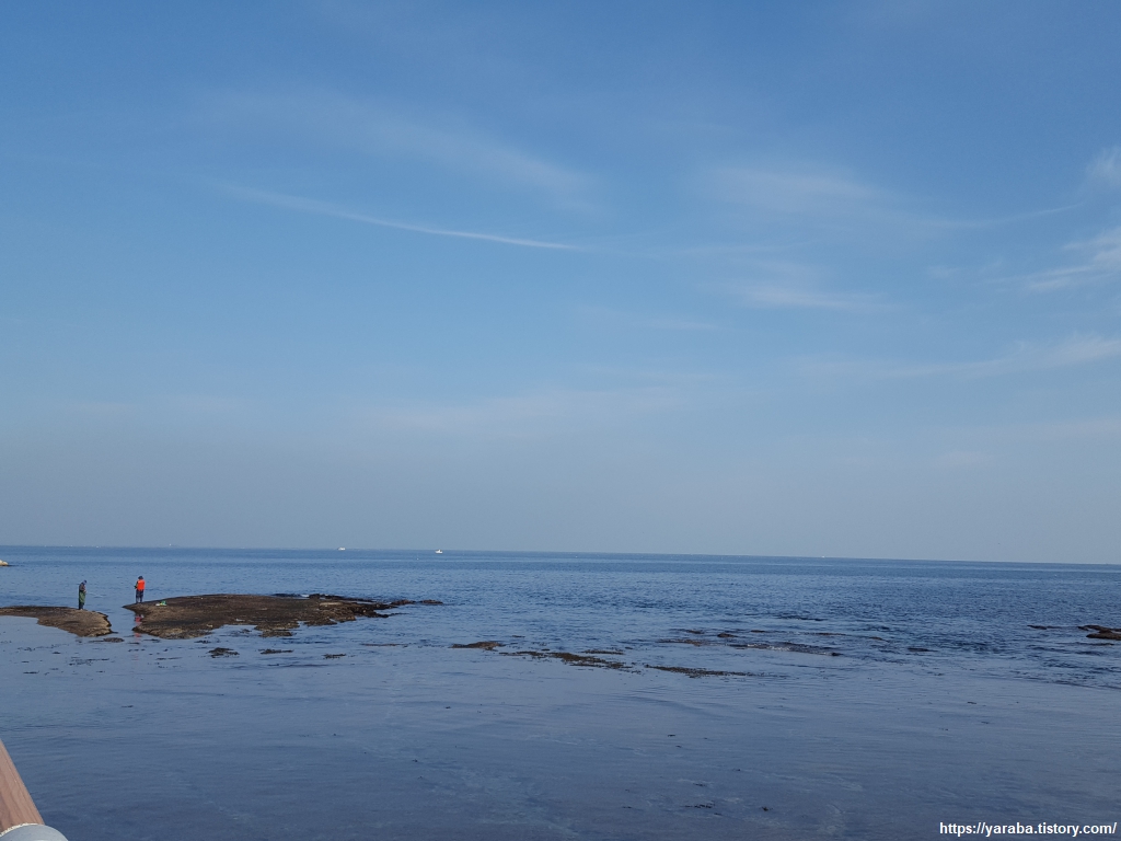 방어 양식장을 지나면 암석 지대와 함께 작은 공원이 조성되어 있다. 아이들용 작은 풀장도 있었다. 갯바위 위에서 낚시하고 있는 낚시꾼들의 모습은 바위 지대가 깊지 않은 모양인지 물 위에서 낚시하고 있는 모양새다.