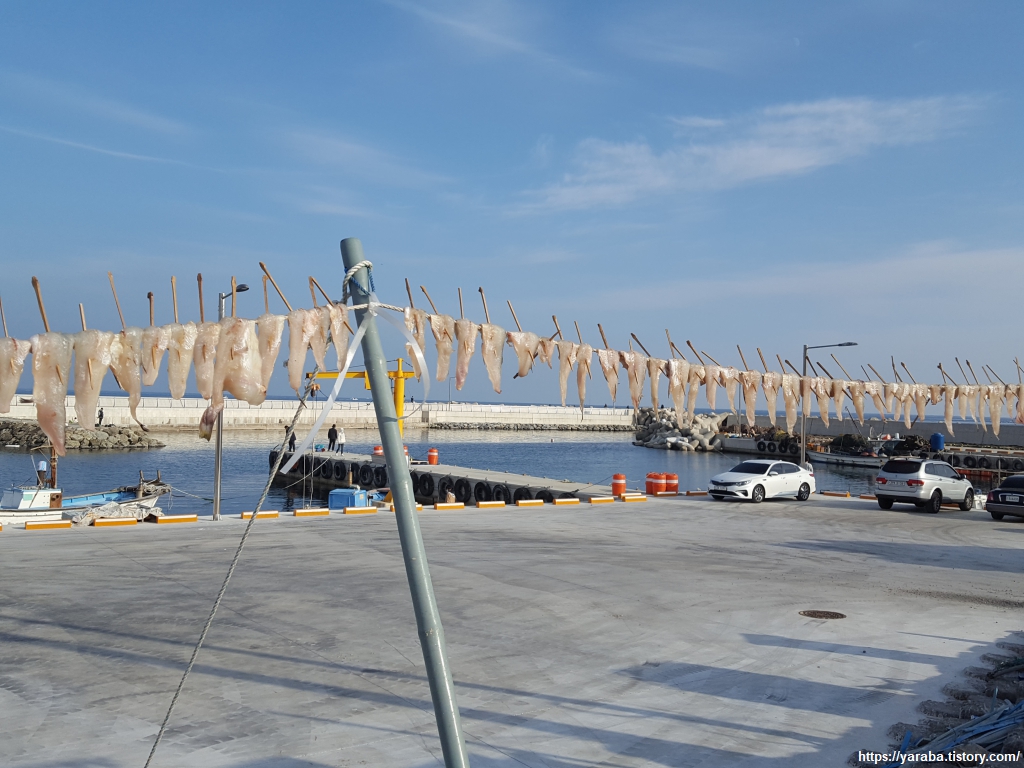 신창 방파제 근처에서는 독특한 모양으로 생선을 말리고 있었다. 생선 살을 발라내어 마치 비녀를 꽂듯이 생선살이 줄에서 떨어지지 않도록 고정해 놓았다. 아마도 꾸덕꾸덕 말린 다음 구워서 술안주로 올라가지 않을까 싶다.