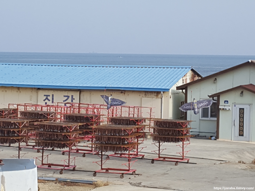 한참 건조하며 맛이 들고 있는 과메기들. 그 주위로 독수리 연이 매달려 있다. 과수원이나 콩 농사 지으시는 농부들이 긴 낚싯대나 장대에 매달아 새를 쫓는 광경을 본 적은 있지만 그 연이 과메기 덕장에도 등장할 줄이야!