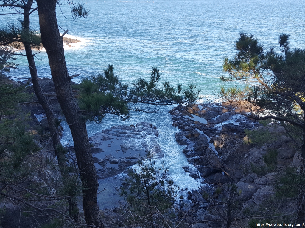 산길을 걷다가 가끔씩 해변으로 내려오면 해변 갯바위를 사정없이 내리치는 파도는 여전히 위압감으로 함부로 까불지 마라! 며 경고하는 듯하다.