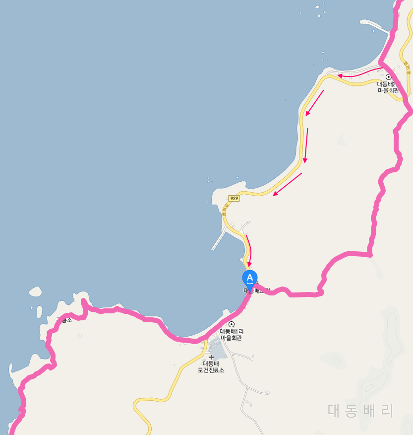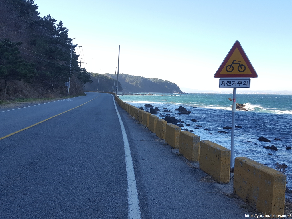 원래의 해파랑길은 대동배 2리에서 산길을 통해 대동배 1리로 간다. 그 대신에 우리가 택한 편한 방법은 929번 호미로를 따라 걷는 것인데 이 도로는 노란 경계석 옆으로는 바로 바위 투성이 해변이기 때문에 객관적으로 보기에도 조금은 위험한 경로임에는 틀림없다. 그래도 어찌하랴, 저질 체력을! 이른 평일 오전 시간이라 차도 거의 없는 길을 조심스레 걸어 나간다.