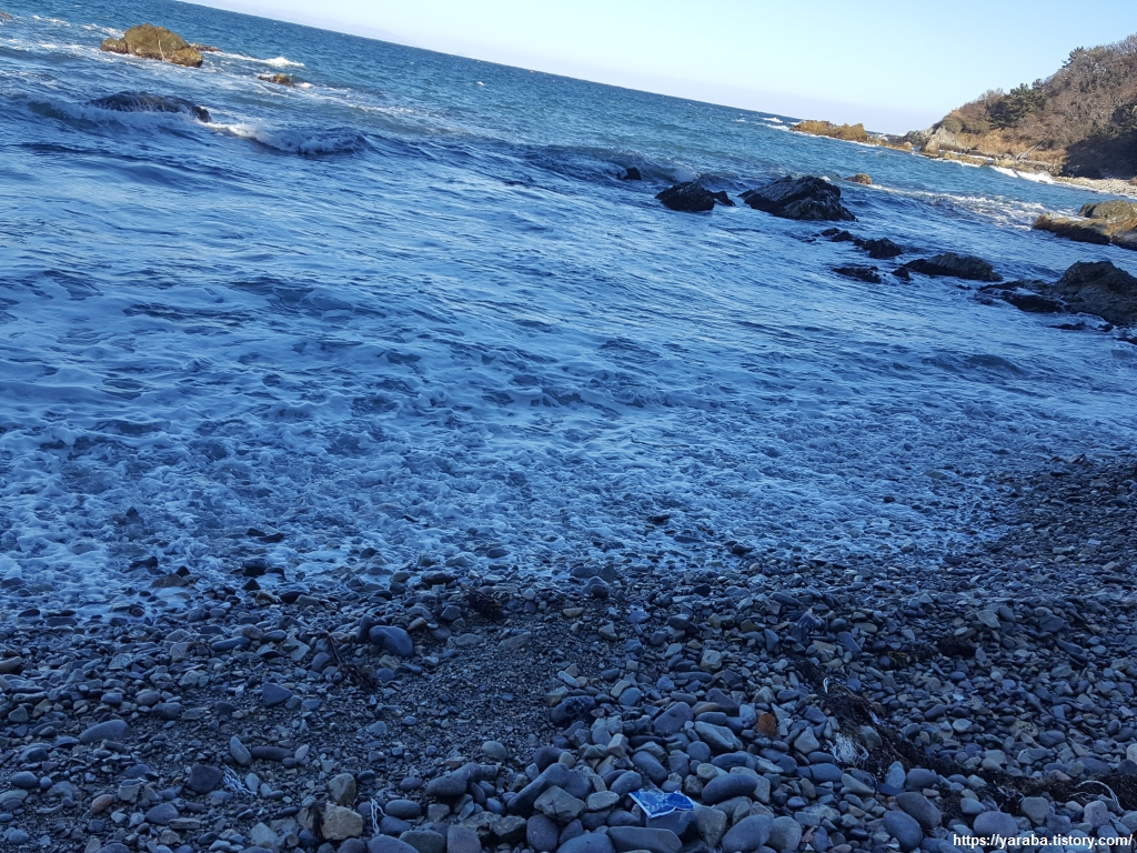 크지 않은 몽돌 해안이지만 세차게 큰 바위를 후려 갈기는 파도 소리와는 하늘과 땅이다.