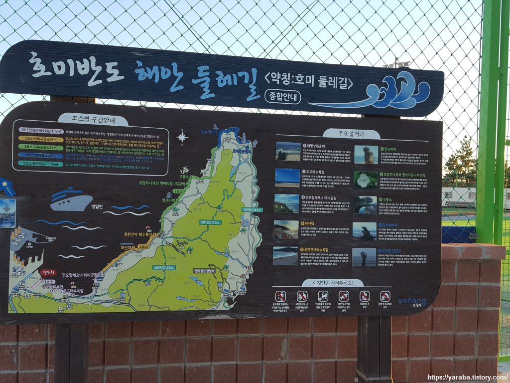 모래 언덕 위 산책길에 이르면 만나게 되는 호미반도 해안 둘레길 안내판. 안내판에서는 해파랑길 15, 16코스가 내륙으로 표시되어 있지만 현재는 해파랑길과 대부분 길을 같이 가기 때문에 해파랑길 13, 14, 15, 16 코스를 걸으면 장기면 두원리에서 이곳 청림동까지 이어지는 호미반도 해안 둘레길을 자연스럽게 모두 걷게 된다.