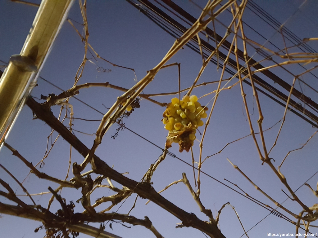 우앙! 12월 한겨울에 청포도가 매달려 있다. 다시 한번 생각해도 포도나무 가로수길은 신박하다. 이쯤에서 이육사의 "청포도"를 다시 한번 읽어야 하지 않겠는가! 다시 읽어도 정말 아름다우면서도 광복을 고대하는 시인의 마음이 가슴으로 전해져 오는 시이다.
